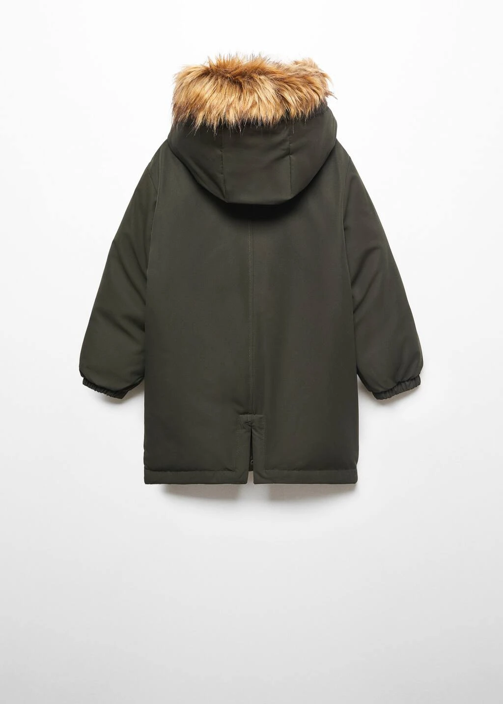 coupe longue, coupe droite, deux poches a rabat, deux poches plaquees sur le devant, capuche avec detail de fausse fourrure, fermeture eclair, etiquette d’identite a l’interieur .Composition: 100% polyester. Doublure: 100% polyester. Rembourrage: 100% polyester