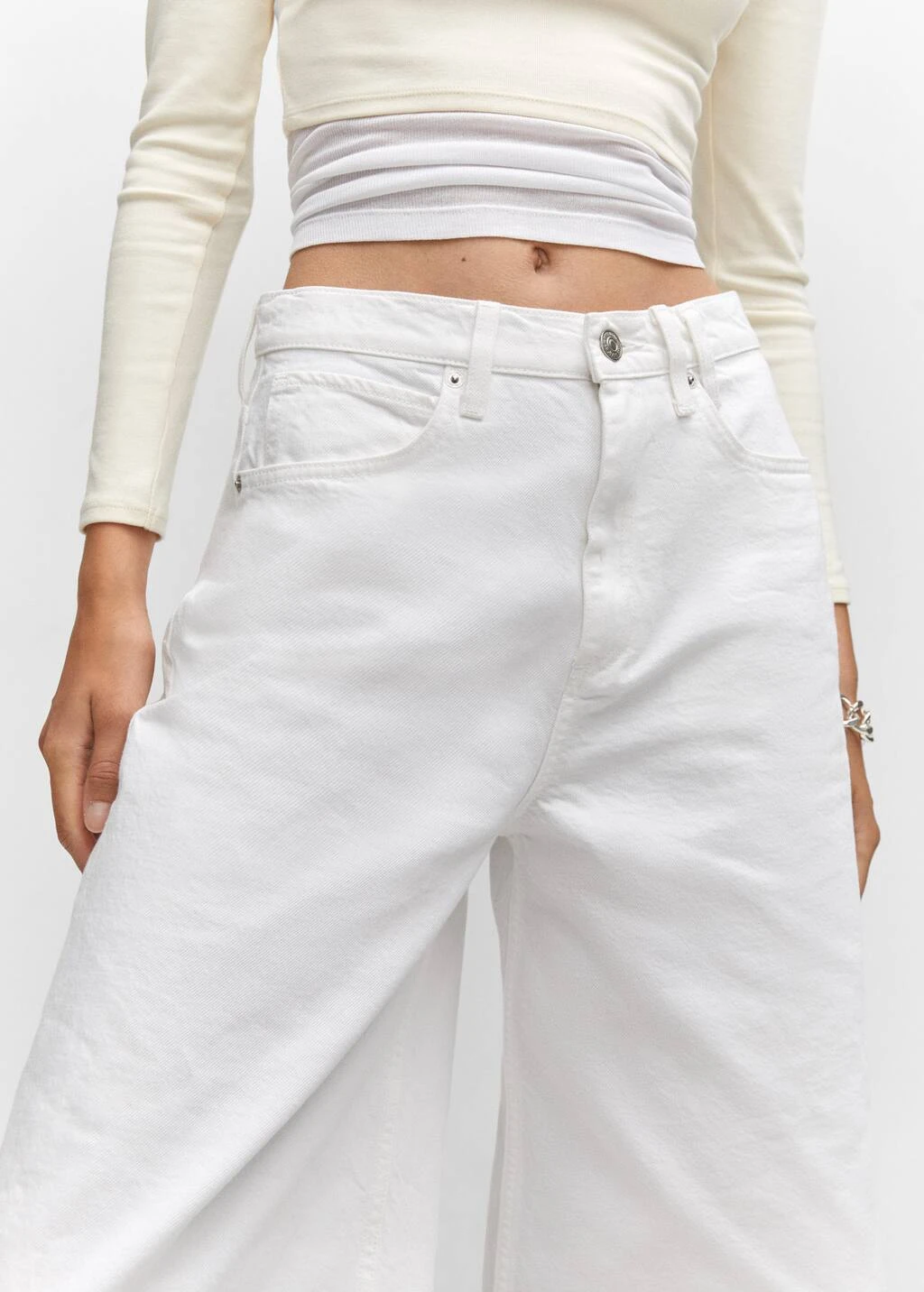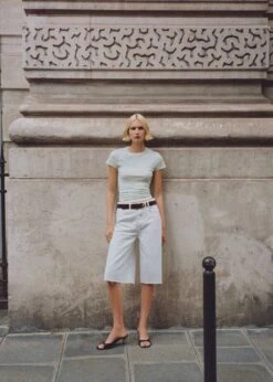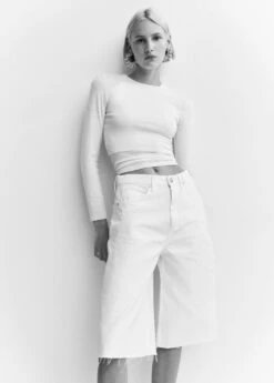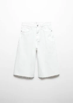 tissu en coton de style jean, coupe wideleg, coupe courte, passants pour la ceinture, cinq poches, fermeture eclair avec bouton, bas effilocheComposition: 100% coton