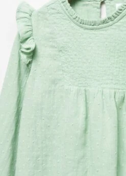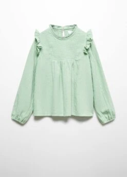 100 % coton, coupe droite, detail brode, details volantes, detail fronce sur le col, detail fronce aux poignets, col rond, manches longues, bouton de fermeture a l’arriereComposition: 100% coton