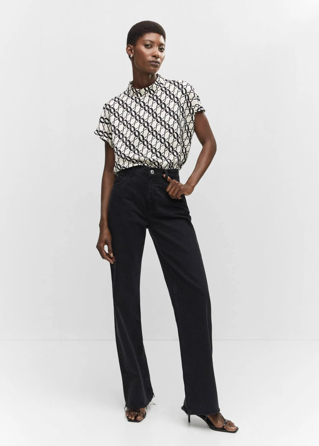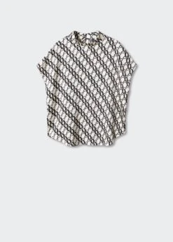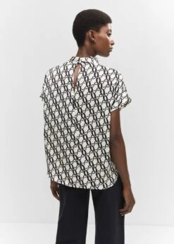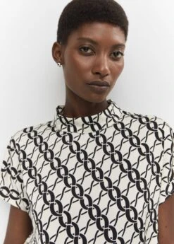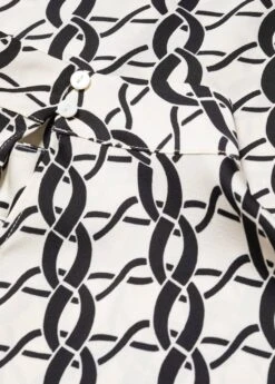 tissu fluide, droit, imprime chaines, col montant, manches courtes, col boutonne, bas arrondiComposition: 100% polyester
