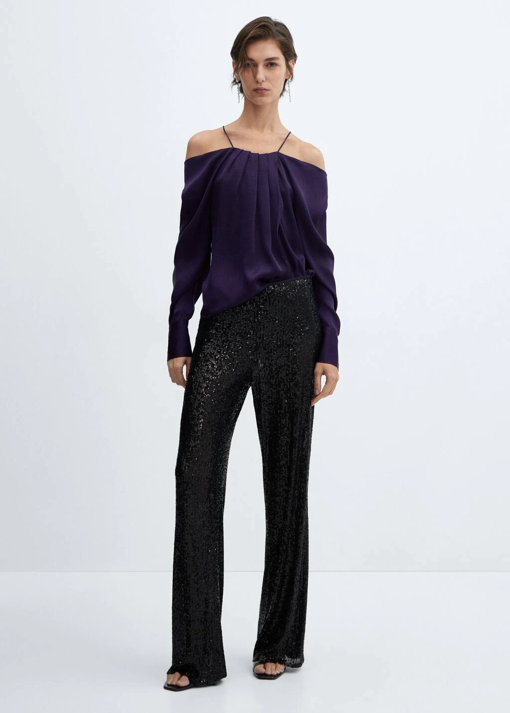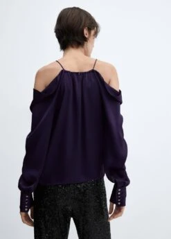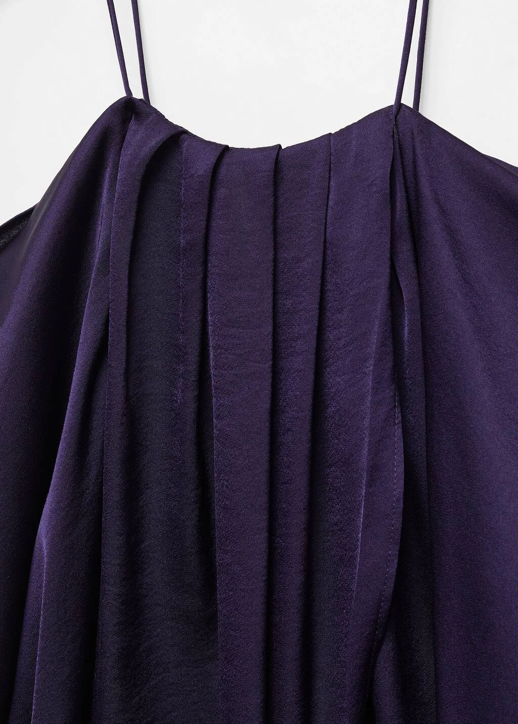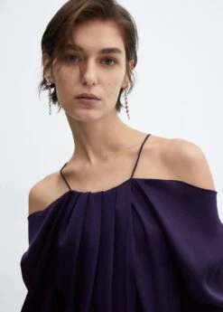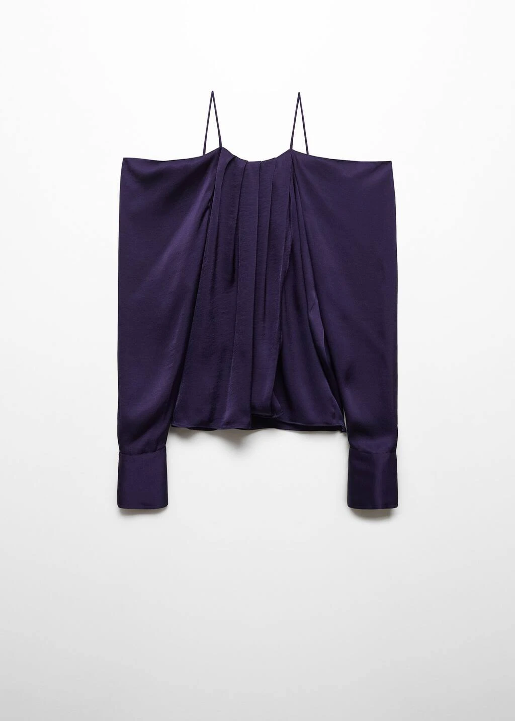 tissu satine, tissu fluide, coupe droite, epaules denudees, bretelles fines, manches longues avec poignets boutonnes, bouton de fermeture a l’arriere, plis decoratifs sur le devant, details drapesComposition: 100% polyester