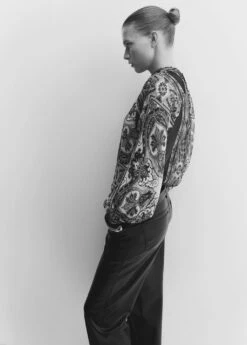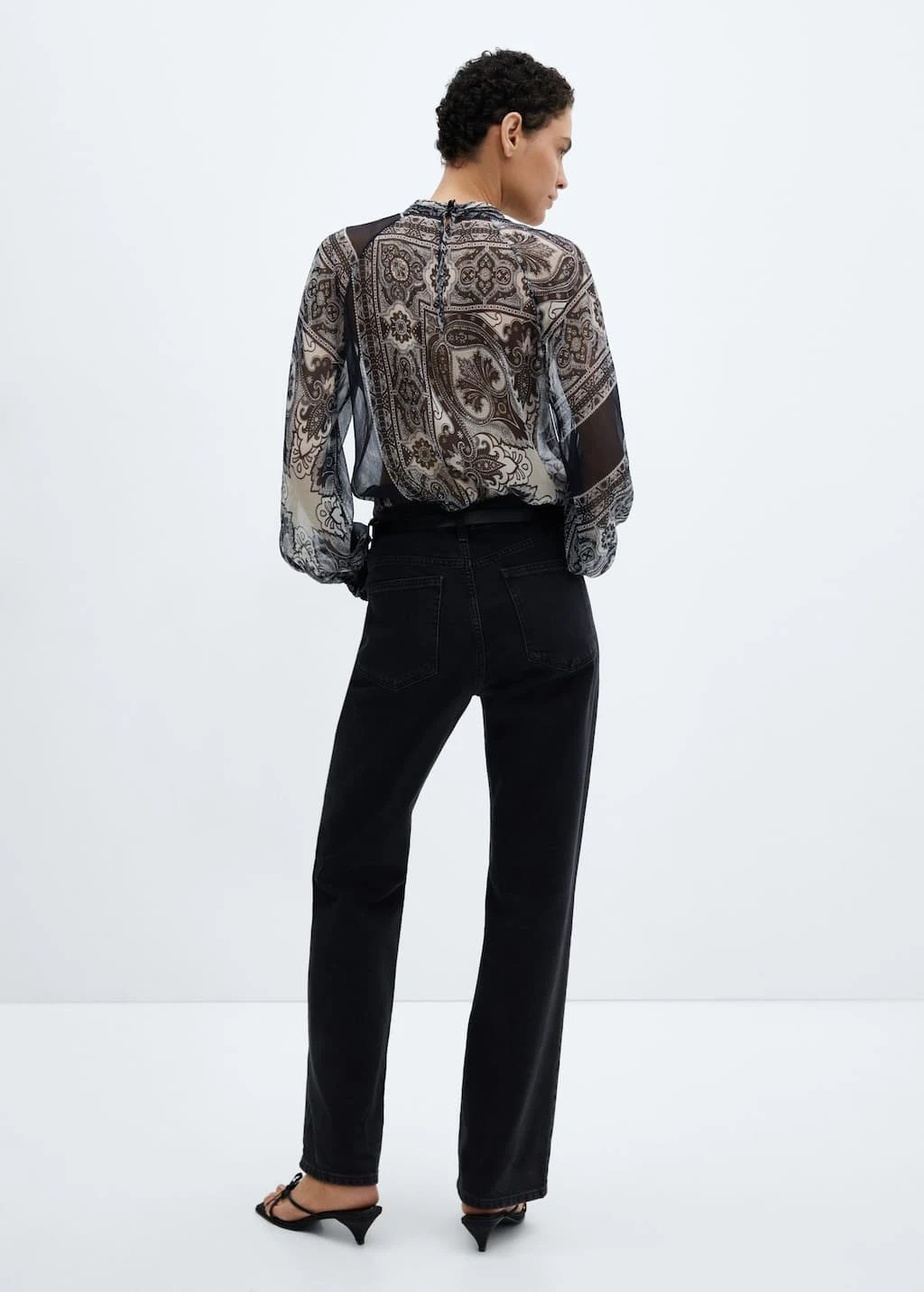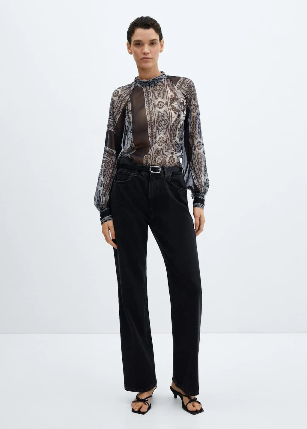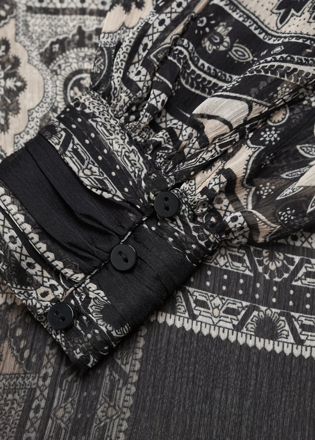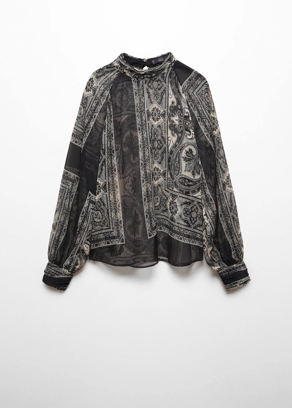 tissu en gaze, tissu fluide, modele semi-transparent, imprime, coupe droite, col roule, manches longues avec poignets boutonnes, manches bouffantes, fermeture en goutte a l’arriereComposition: 100% polyester