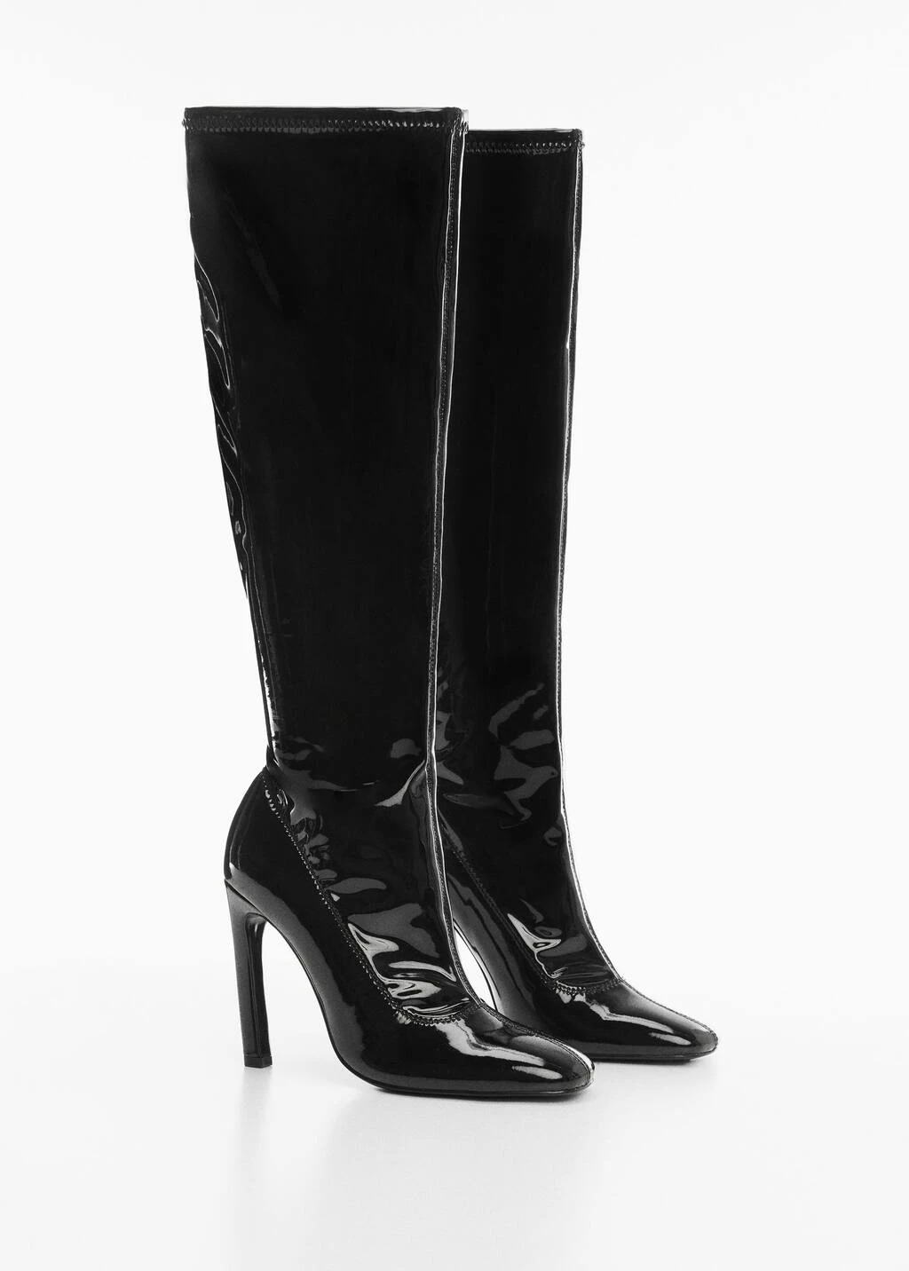 effet verni, bout rond, talon aiguille, talon de 9,5 cm, bottes hautes , sans fermeture, coutures decoratives, doublure.Carre: 100% polyurethane. Doublure: 76% polyurethane,24% polyester. Semelle: 100% polyurethane. Semelle: 100% caoutchouc. Fixation semelle: 100% collée