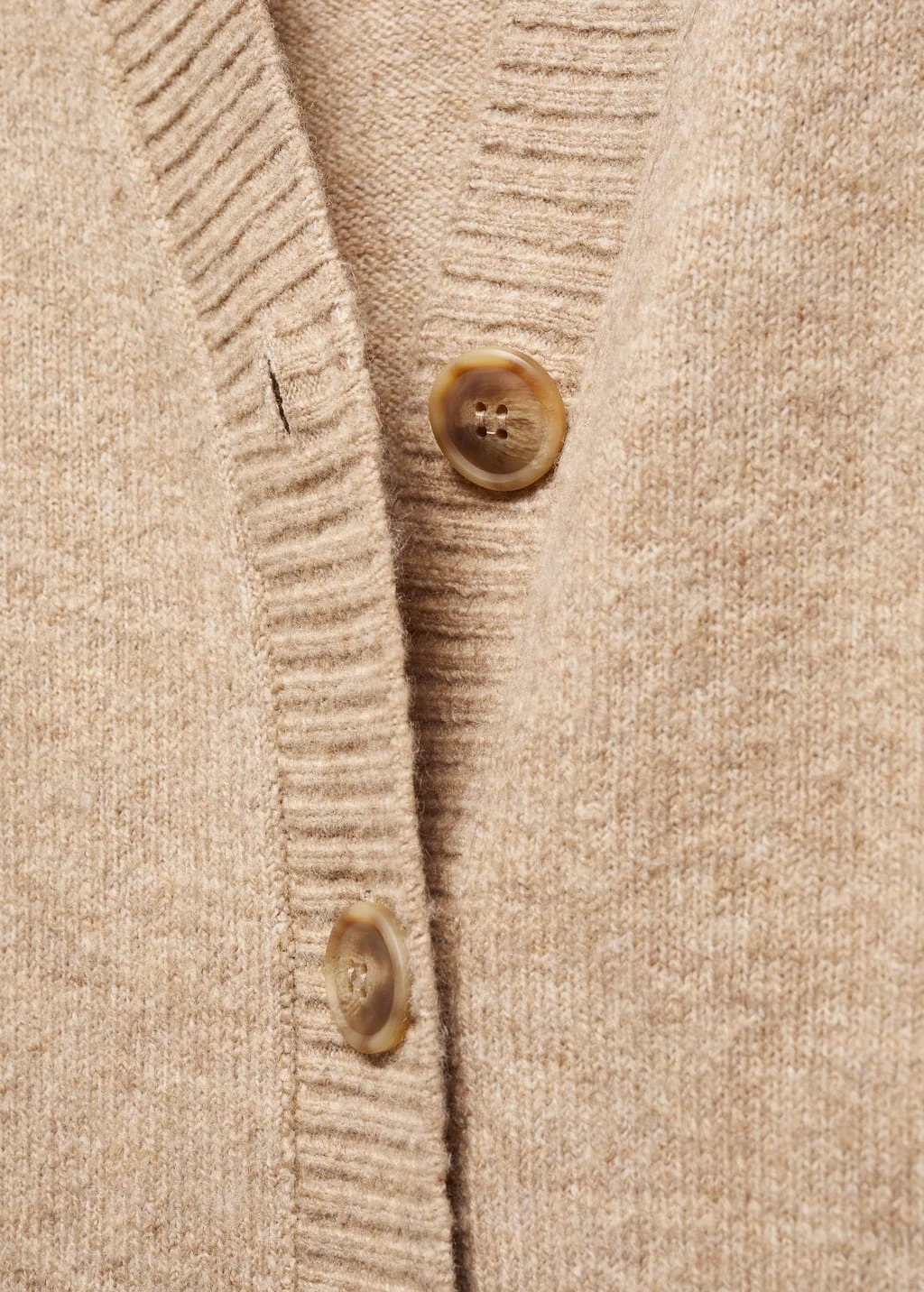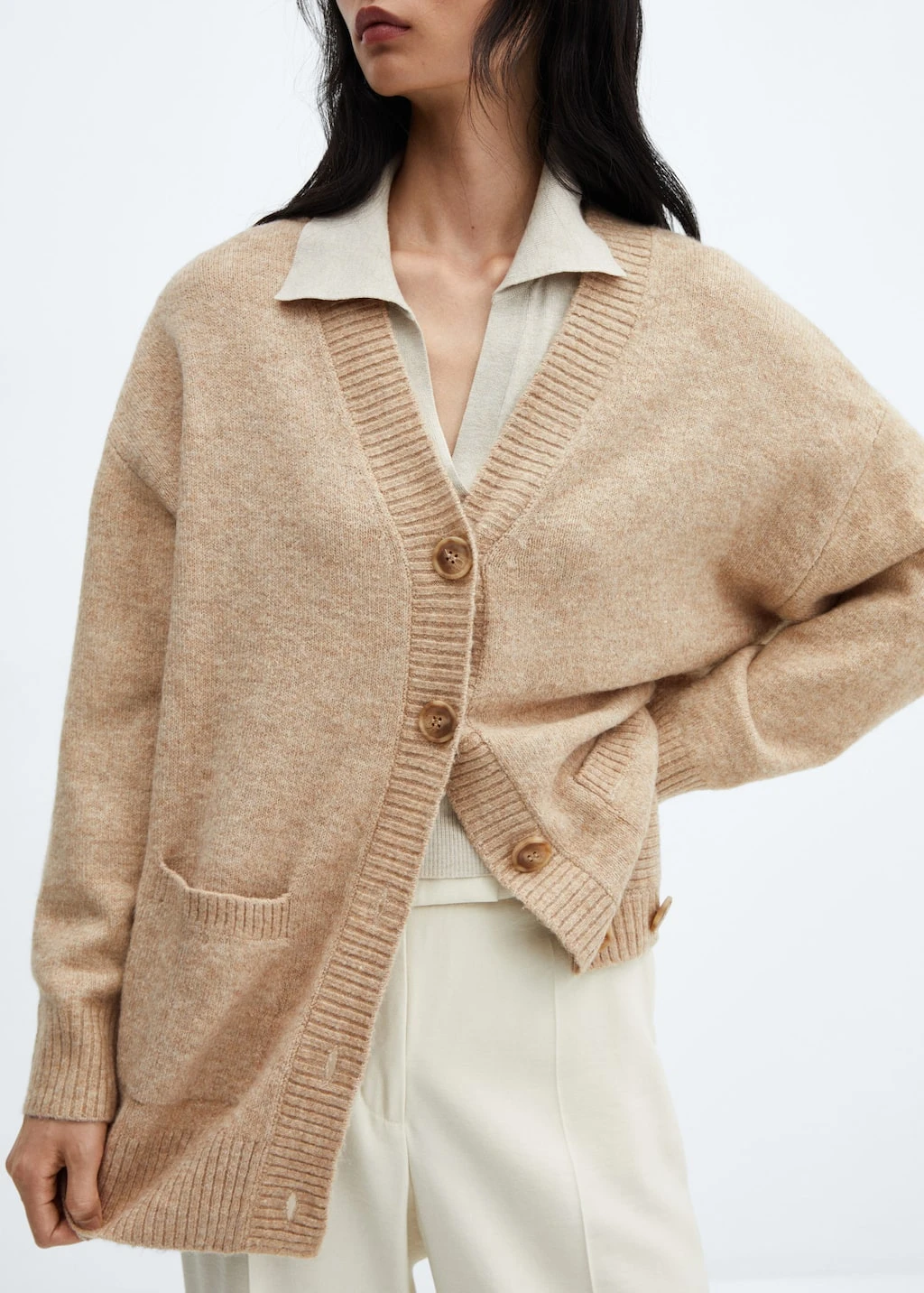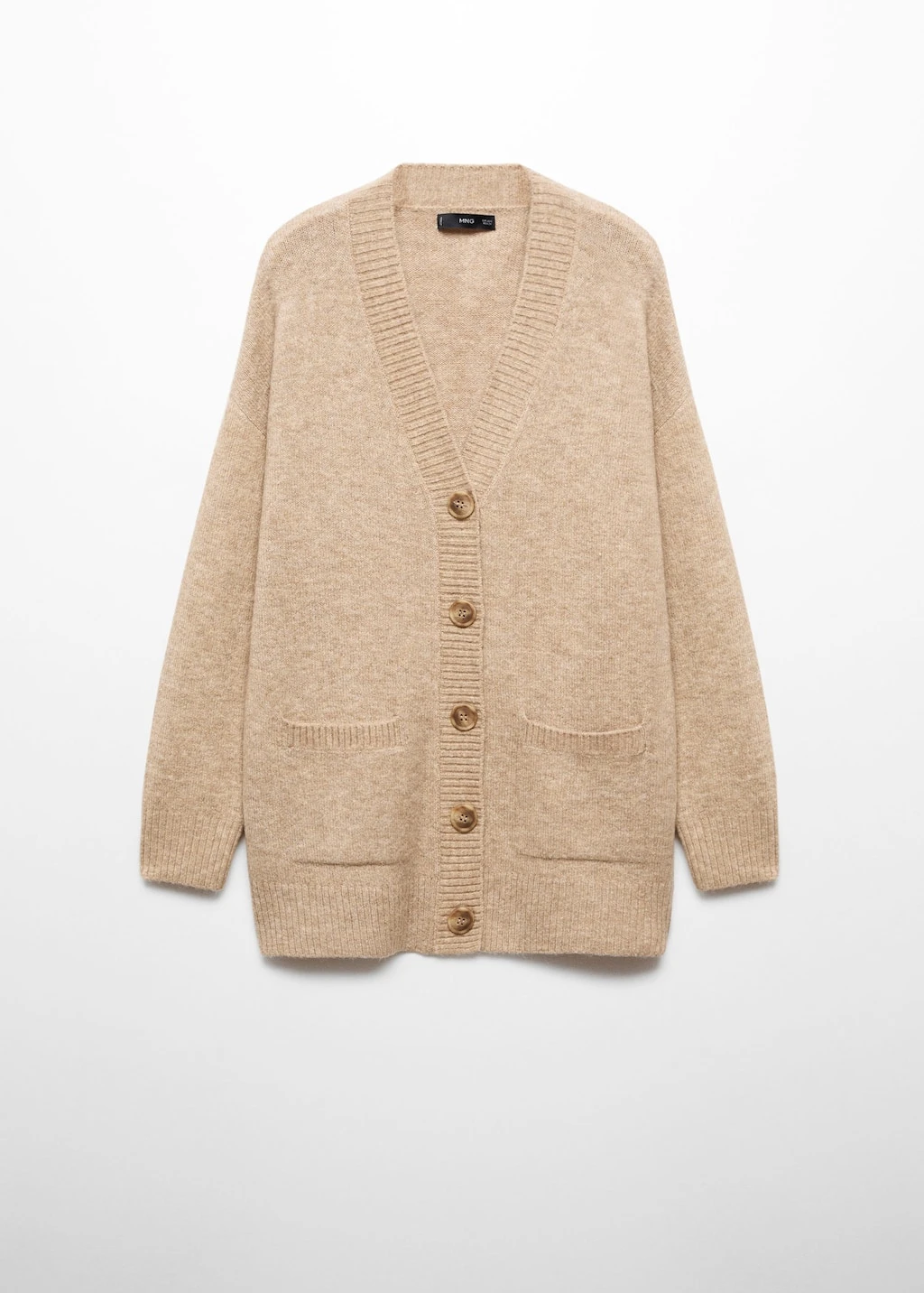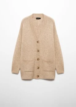 tissu en grosse maille, tissu de laine melange, droit, coupe longue, col en v, manches longues, deux poches plaquees sur le devant, fermeture boutonnee sur le devantComposition: 50% acrylique,44% polyester,5% laine,1% elasthanne