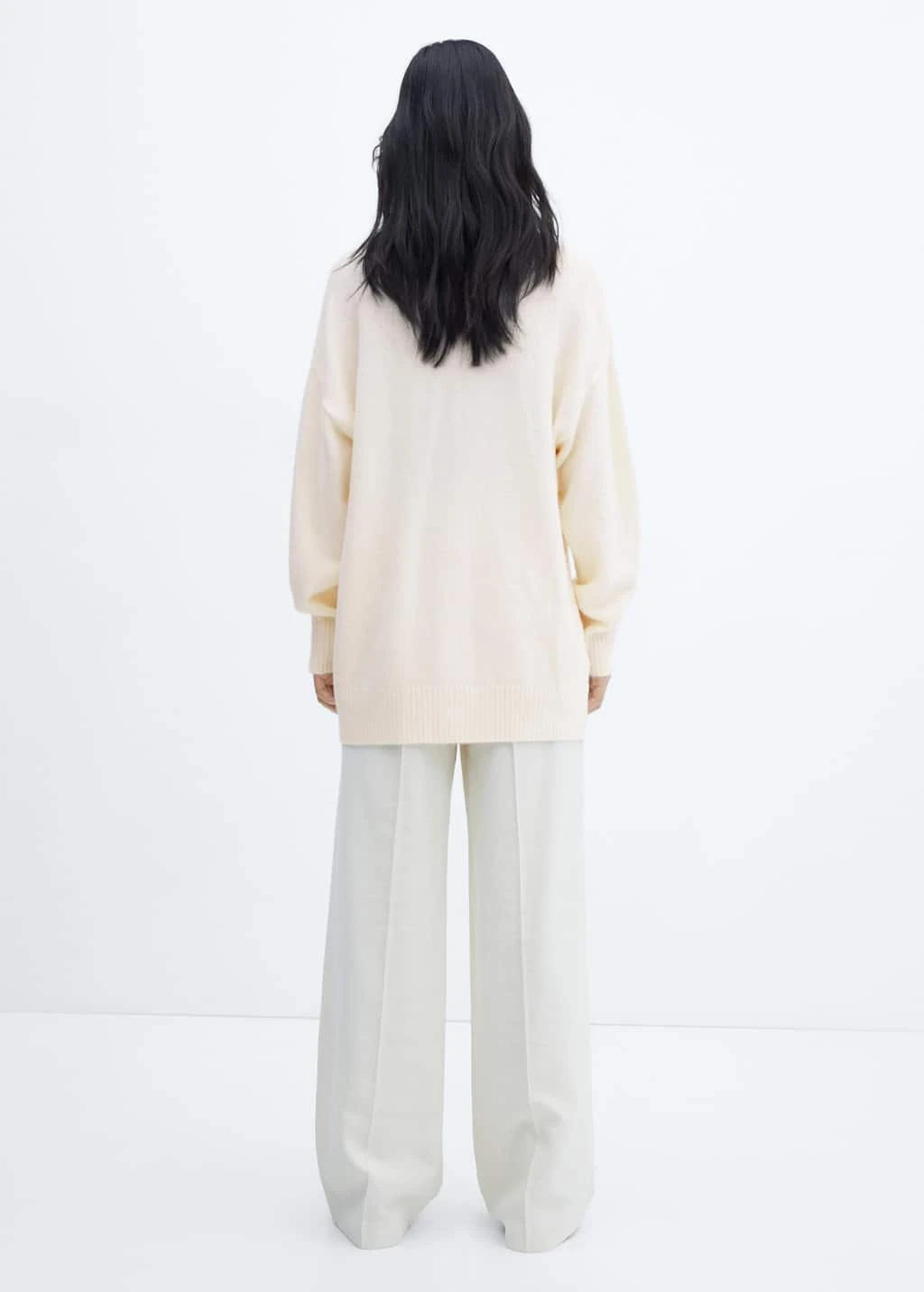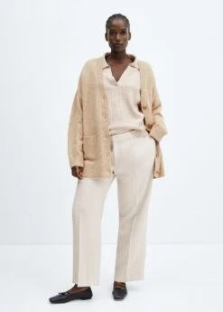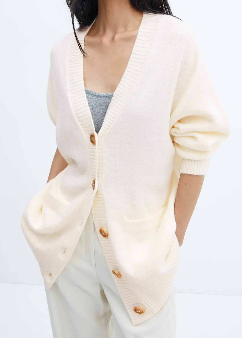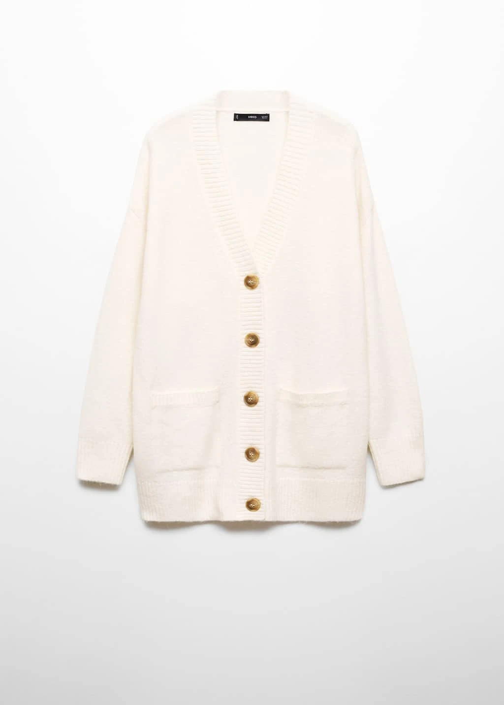 tissu en grosse maille, tissu de laine melange, droit, coupe longue, col en v, manches longues, deux poches plaquees sur le devant, fermeture boutonnee sur le devantComposition: 50% acrylique,44% polyester,5% laine,1% elasthanne