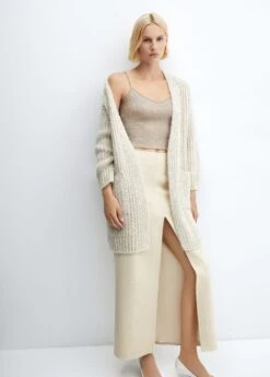 tissu en grosse maille, style oversize, coupe longue, manches longues, deux poches plaquees sur le devant, sans fermeture, detail en lurex, bords coteles, disponible plus.Composition: 55% acrylique,29% polyester,16% polyester avec revêtement de aluminium