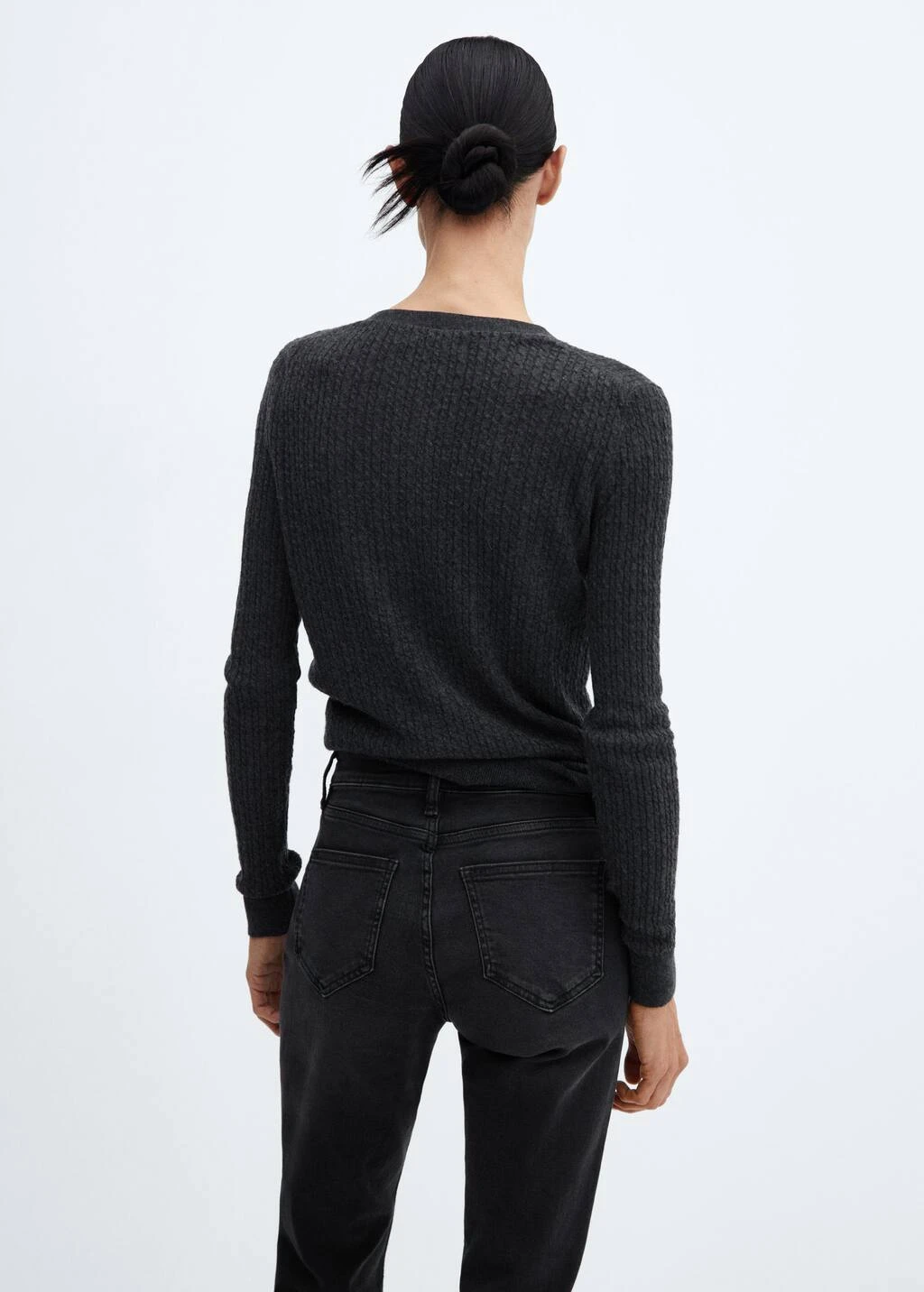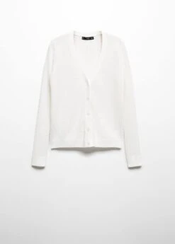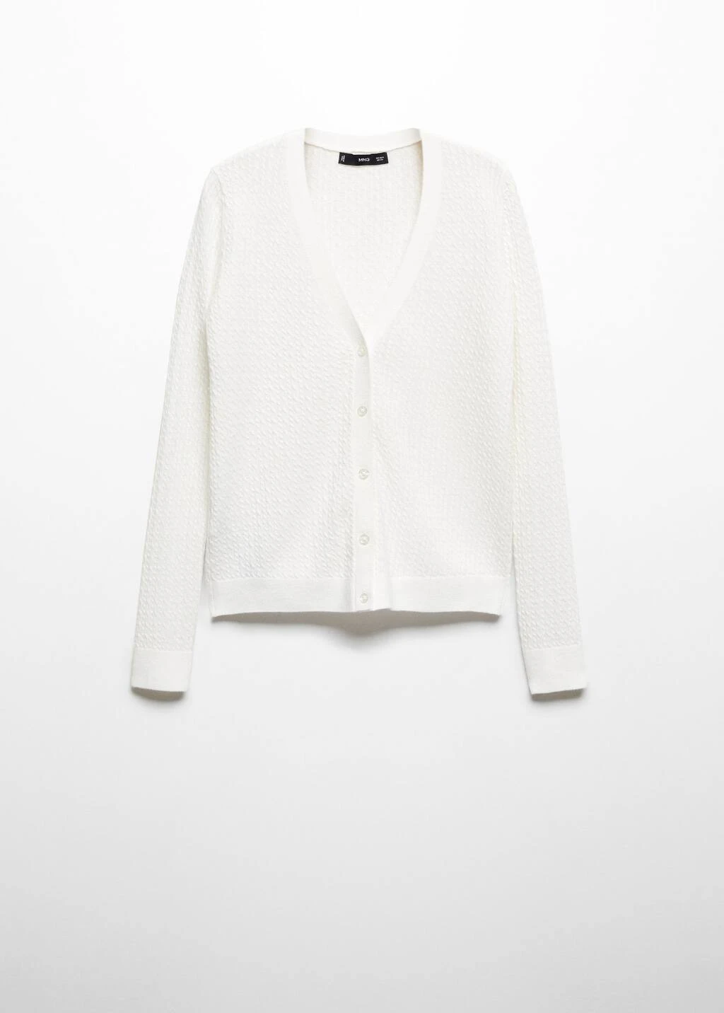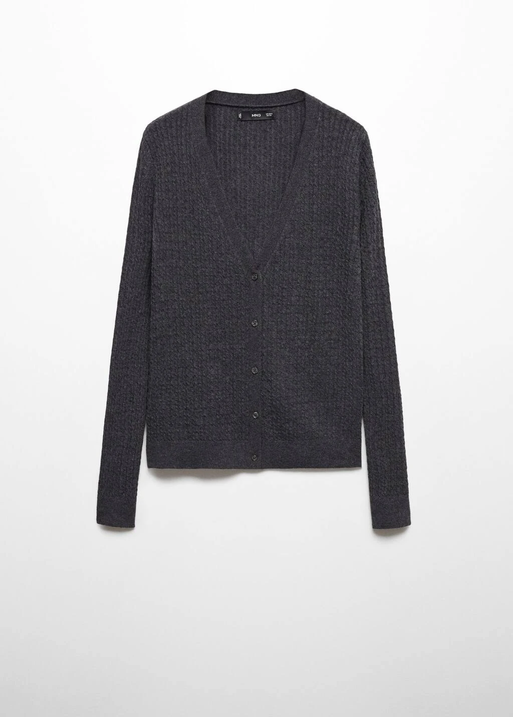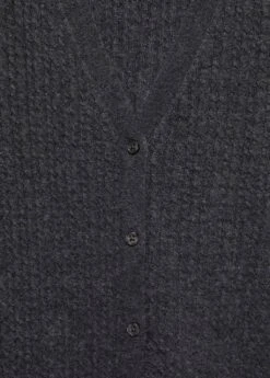 tissu en maille fine, tissu maille torsadee, tissu melange de laine recyclee, coupe cintree, col en v, manches longues, fermeture boutonnee sur le devant, bords cotelesComposition: 45% laine,26% polyamide,23% viscose,6% cashmere