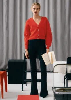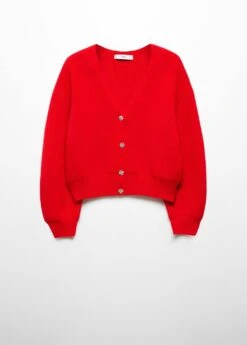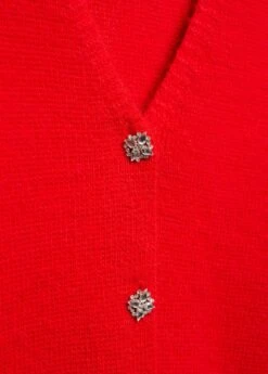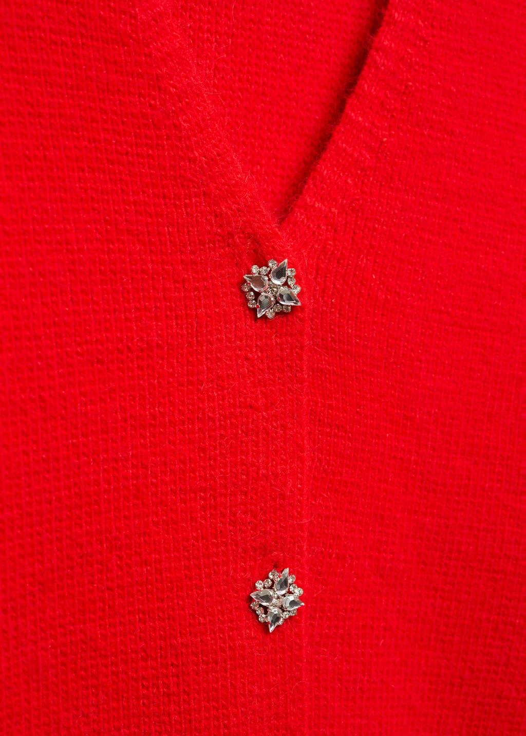 maille moyenne, coupe droite, col en v, manches longues, manches bouffantes, fermeture a boutons sur le devant, boutons effet bijoux, couture tombante sur l’epauleComposition: 85% acrylique,8% polyester,7% polyamide