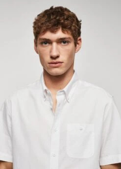100 % coton, tissu leger, regular-fit, col americain boutonne, fermeture a boutons sur le devant, poche plaquee a bouton sur la poitrine, manches courtes, bas arrondi, le mannequin mesure 190 cm et porte une taille mComposition: 100% coton