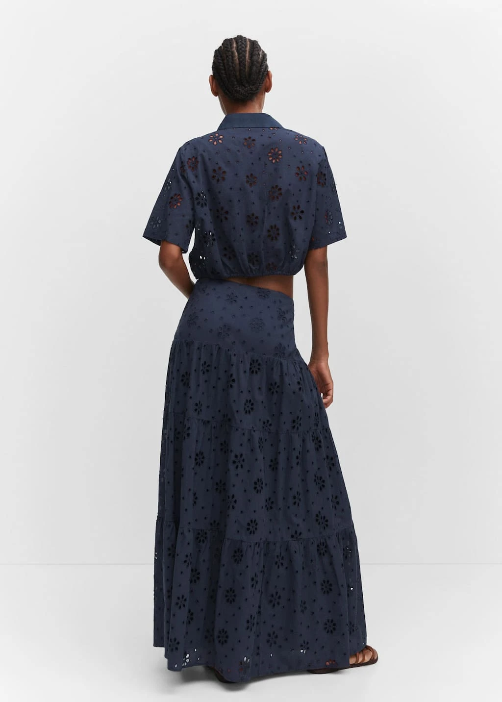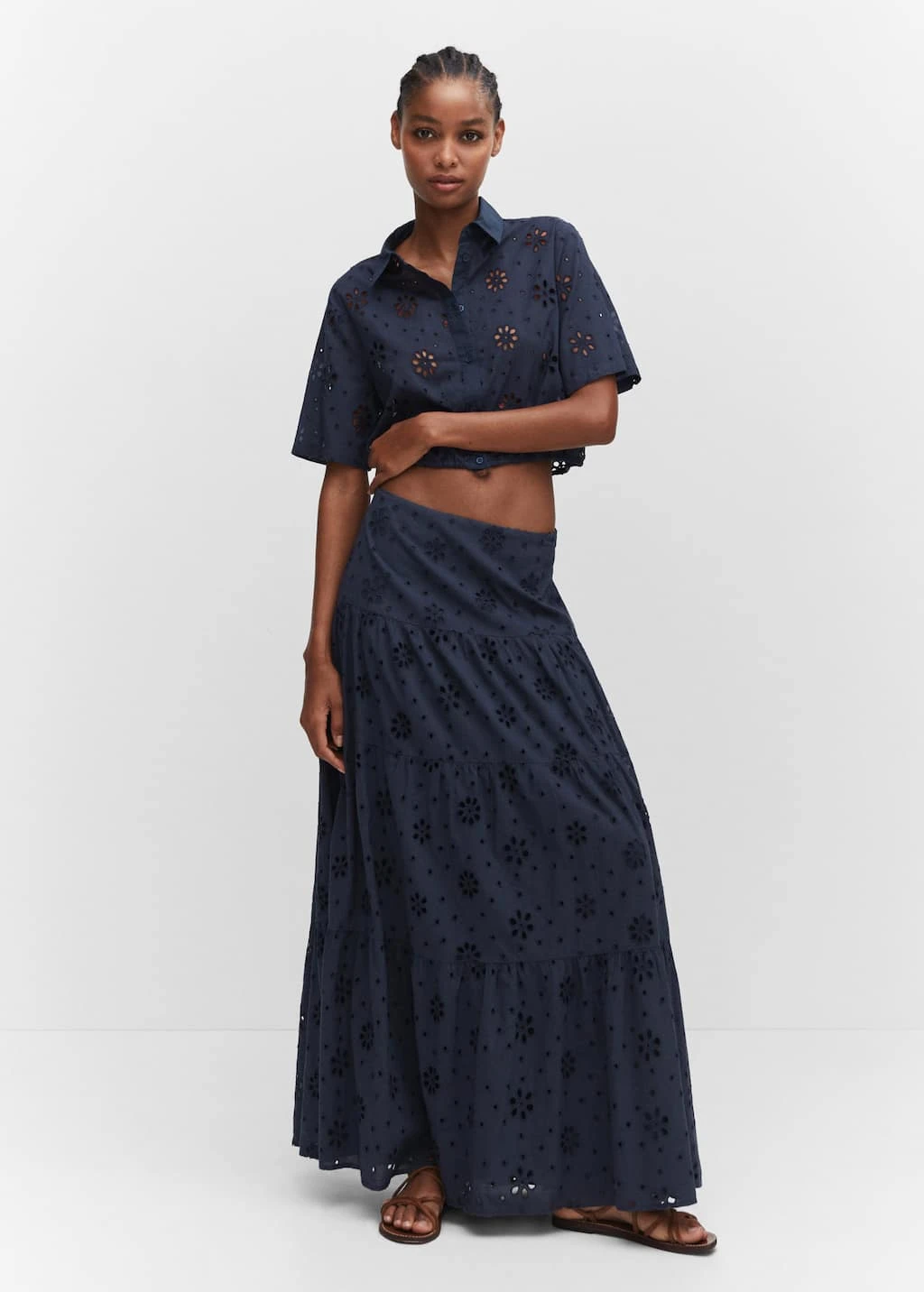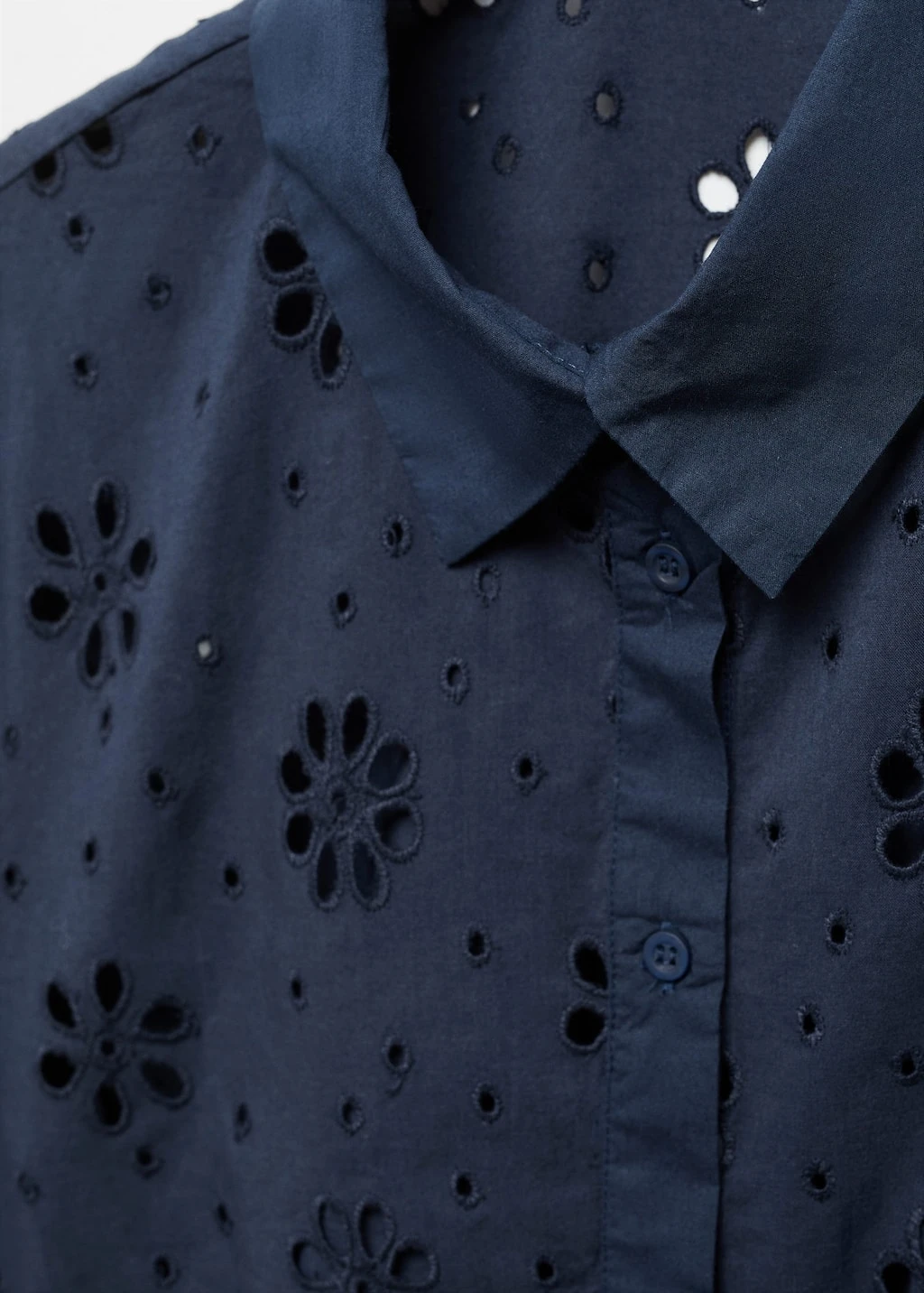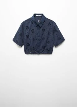 tissu 100Â % coton, tissu a broderies anglaises, coupe droite, style crop, col chemise, manches courtes, fermeture boutonnee sur le devant, bas elastique, details brodes, details ajoures, total lookComposition: 100% coton