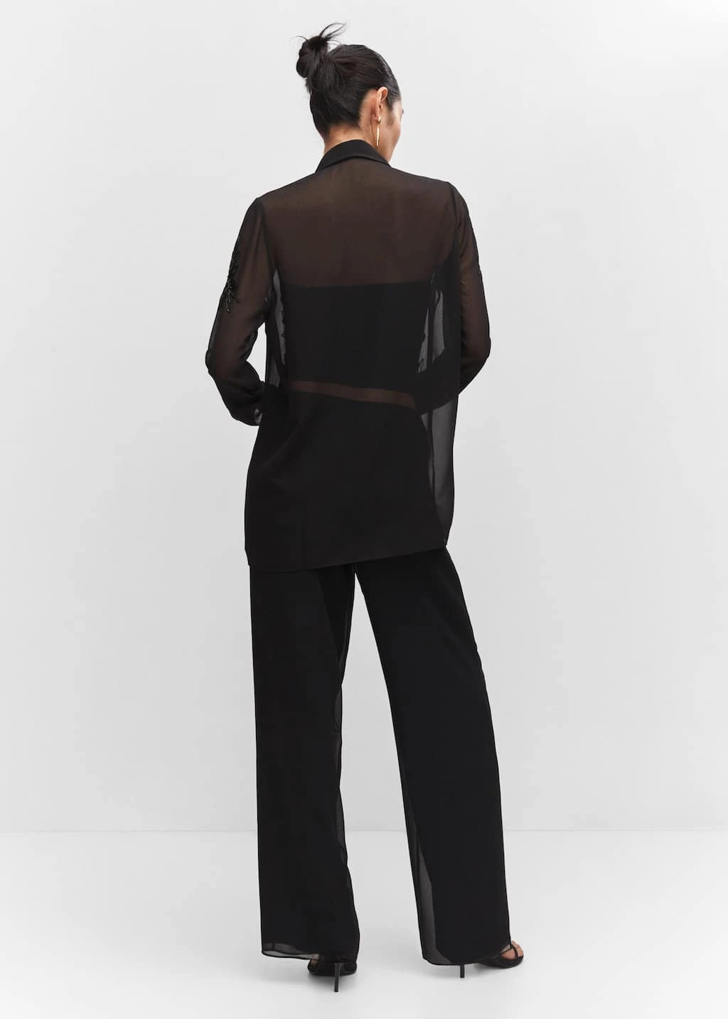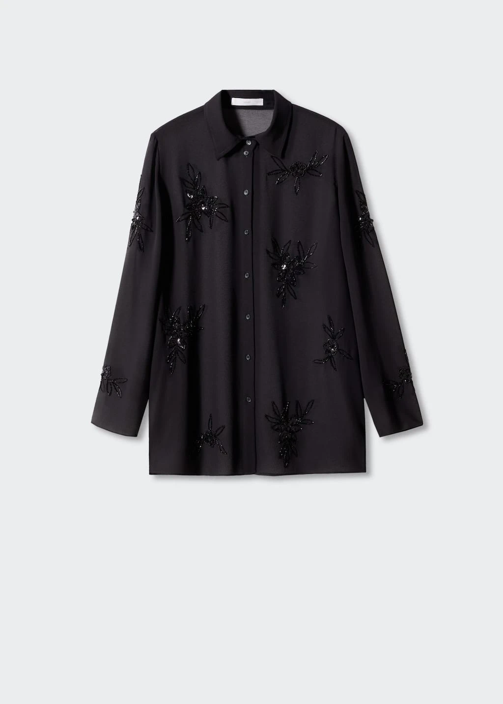 tissu fluide, style oversize, coupe longue, col chemise, manches longues, fermeture boutonnee sur le devant, detail perle, total look, collection fetes et ceremoniesComposition: 50% polyester,50% polyester recyclé. Ornement: 100% verre. Sequin: 100% polyester