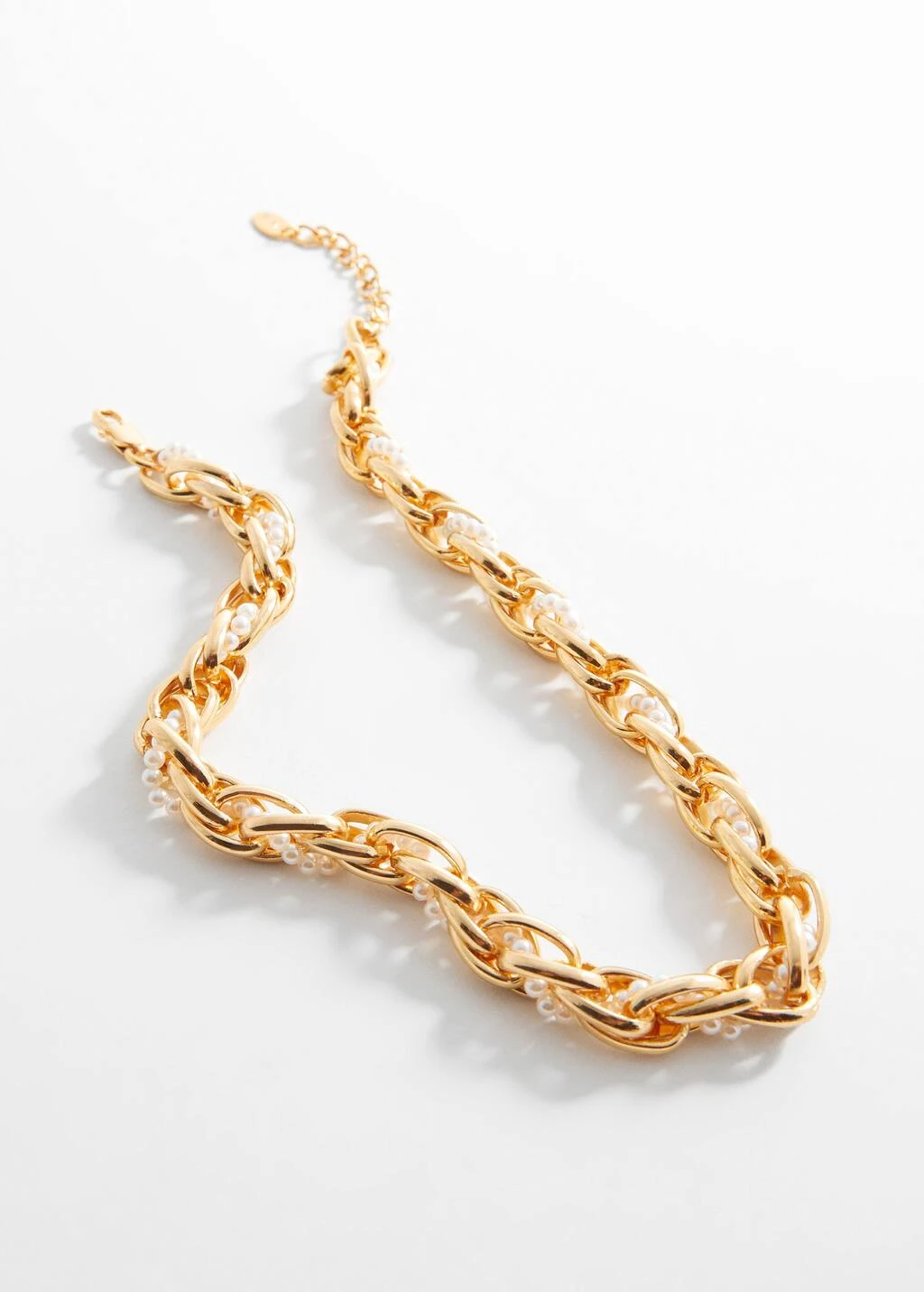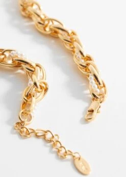 anneaux metalliques, design entrelace, ornement perle, fermoir a chainette et mousquetonComposition: 75% fer,15% acrylique,5% laiton,5% polyester