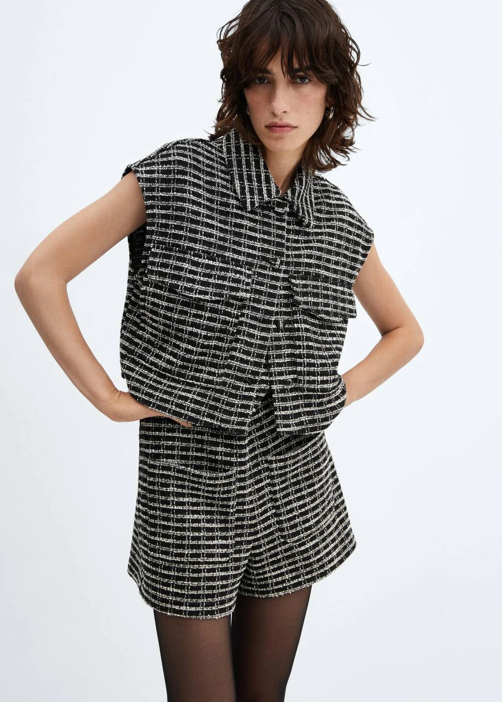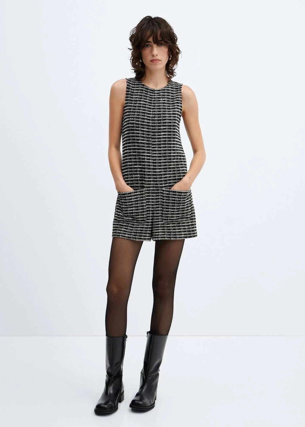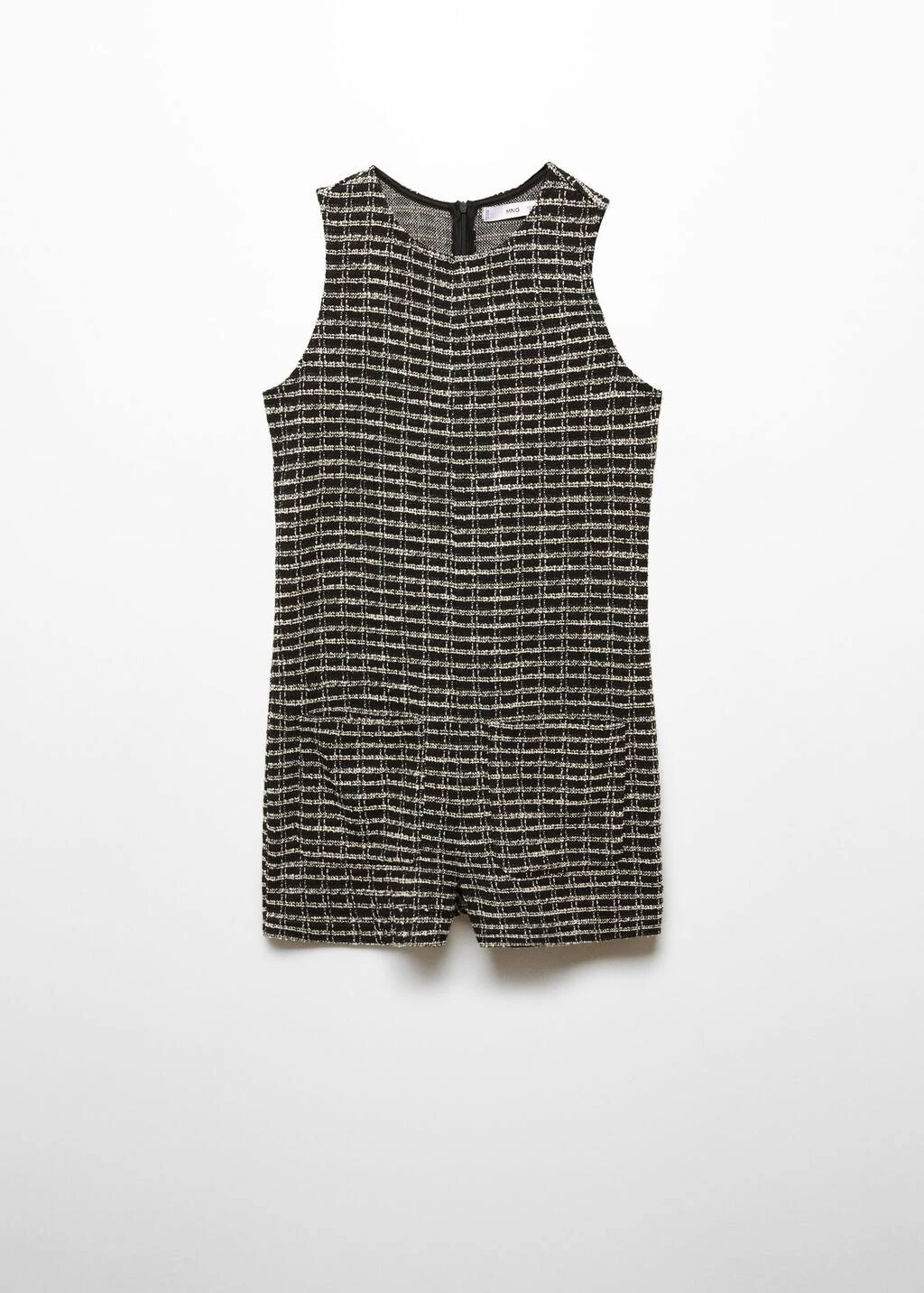 tissu de coton melange, tissu tweed, coupe droite, coupe courte, col rond, sans manches, bretelles larges, deux poches plaquees sur le devant, fermeture eclair a l’arriereComposition: 62% polyester,24% coton,8% viscose,2% acrylique,2% polyamide,2% laine