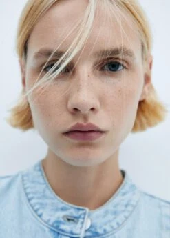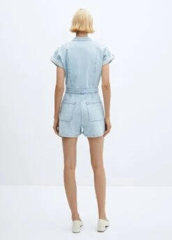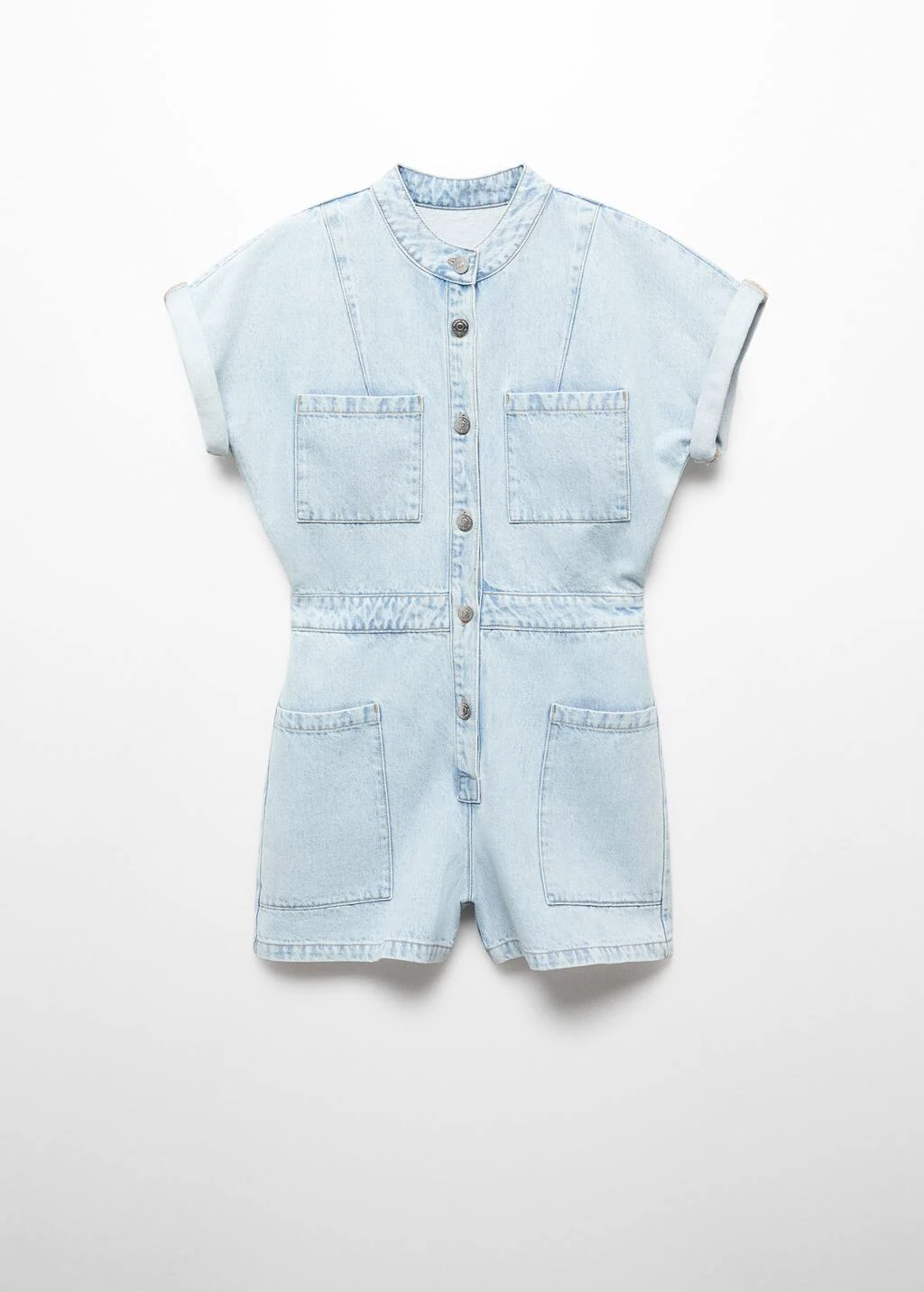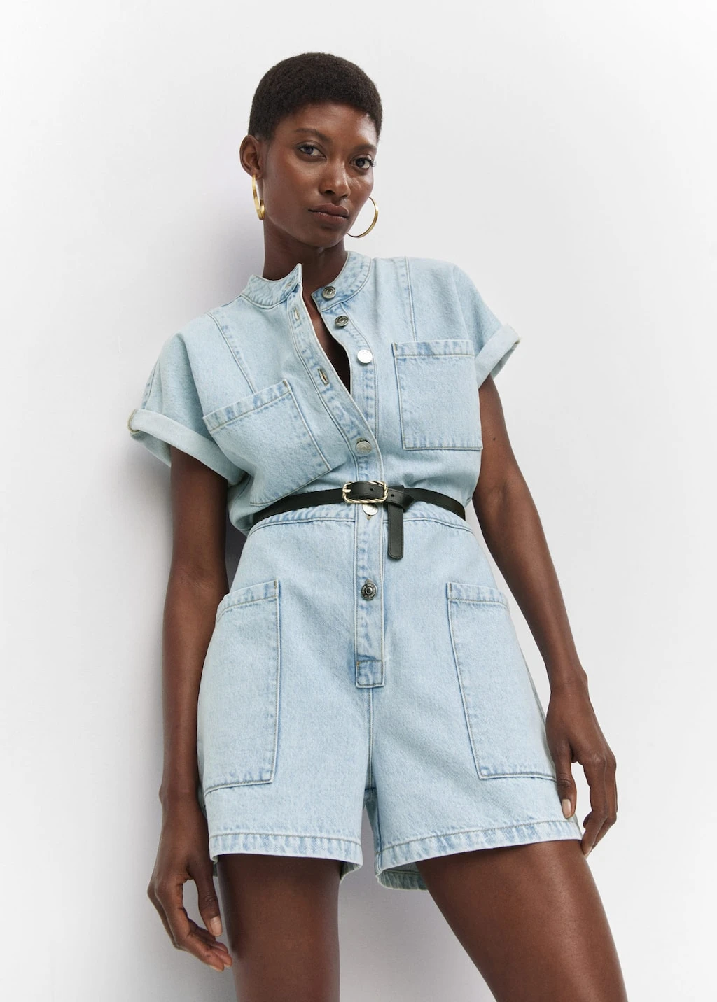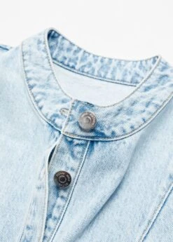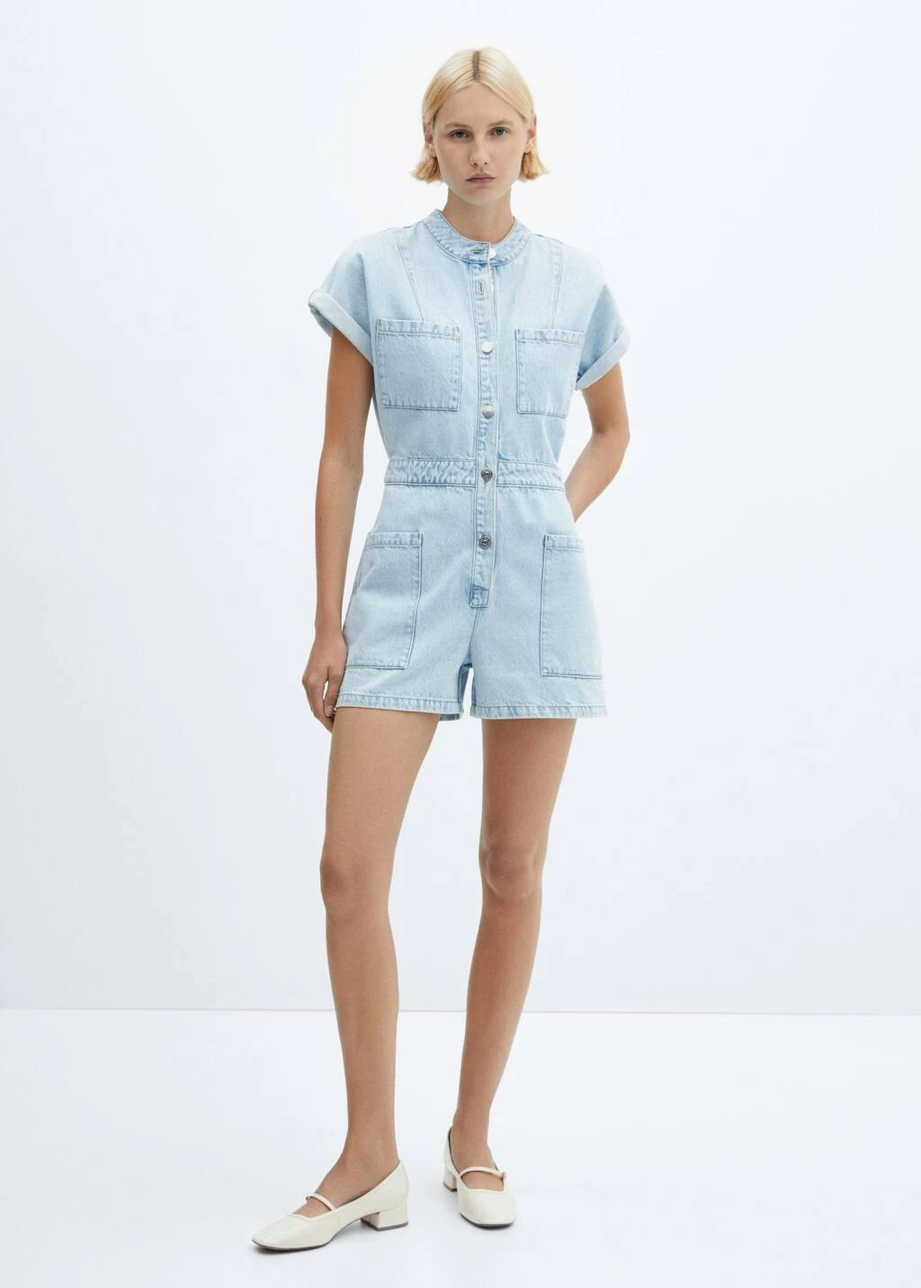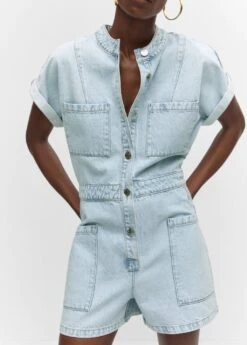 tissu en coton de style jean, coupe droite, coupe courte, col officier, manches courtes retournees, quatre poches plaquees a l’avant, fermeture boutonnee sur le devant, le mannequin mesure 179 cm et porte une taille 36Composition: 100% coton