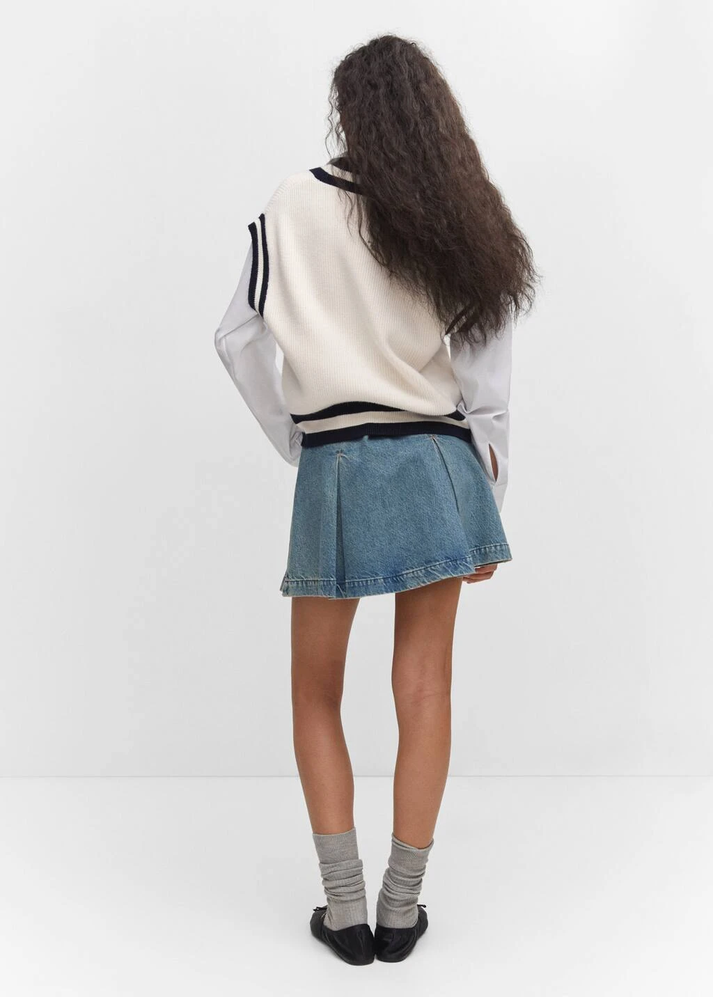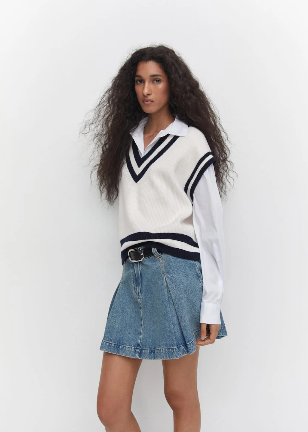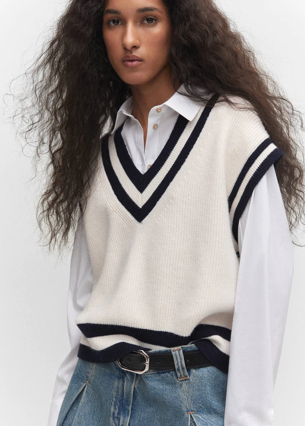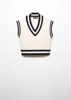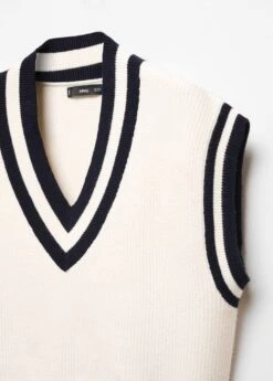 tissu en grosse maille, coupe droite, col en v contrastant, sans manches, bord contrastant, bords coteles, sans fermetureComposition: 50% viscose,28% polyester,22% polyamide