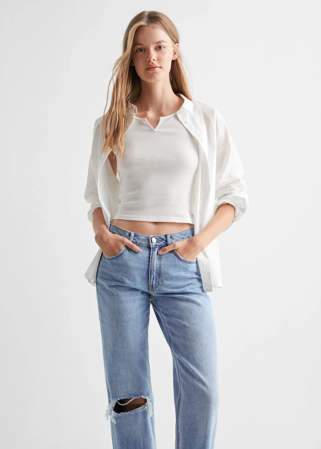 tissu en coton de style jean, taille normale, coupe droite, coupe longue, cinq poches, fermeture eclair avec bouton, reversComposition: 100% coton