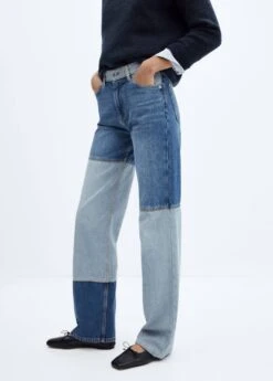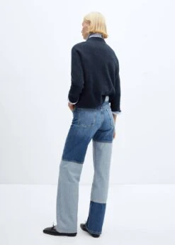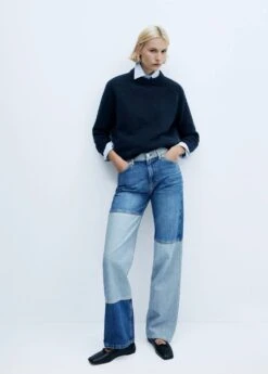 tissu en coton de style jean, coupe wideleg, motif patchwork, taille haute, passants pour la ceinture, cinq poches, fermeture eclair avec bouton, longueur interieure 72 cm, le mannequin mesure 179 cm et porte une taille 36Composition: 100% coton