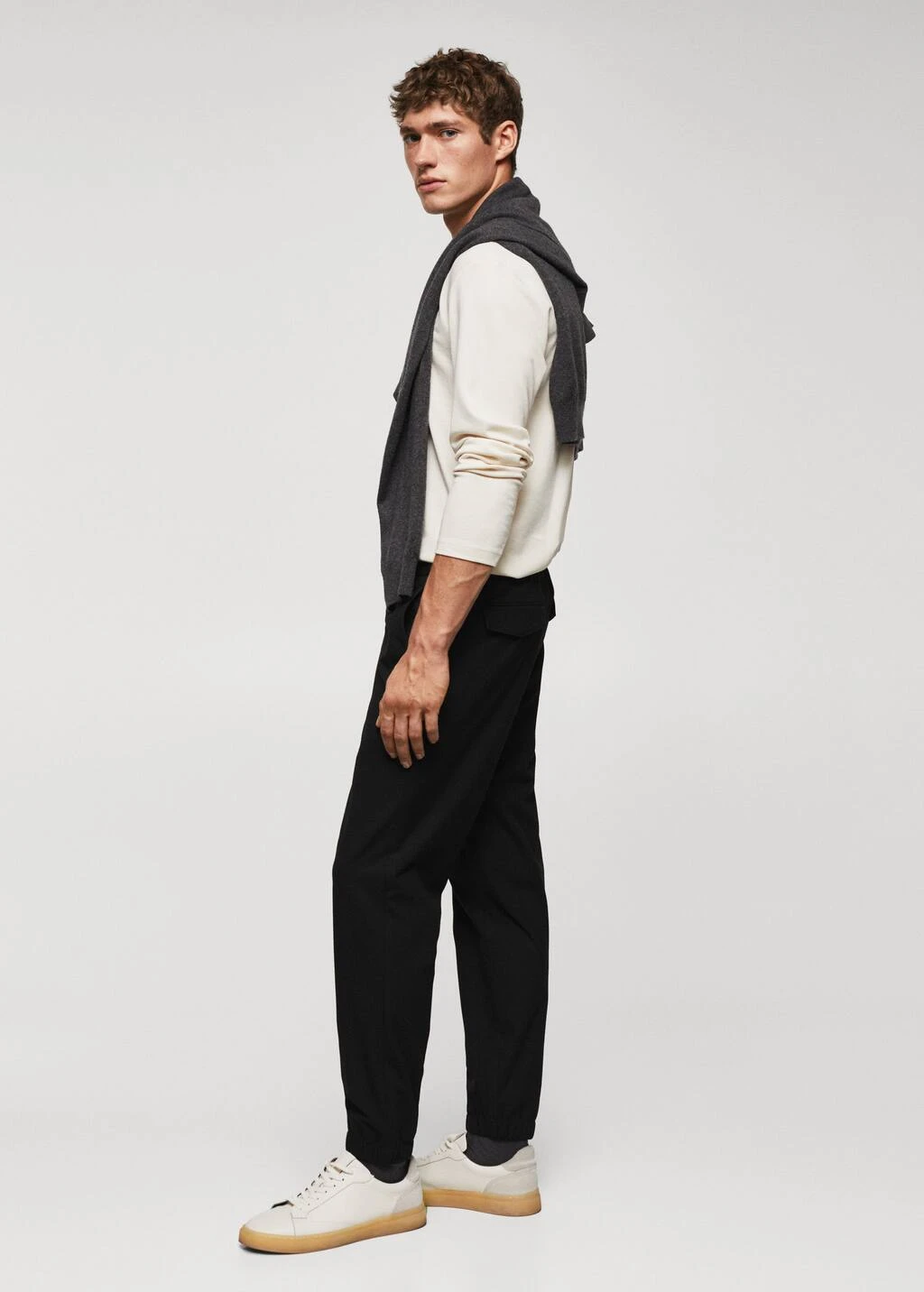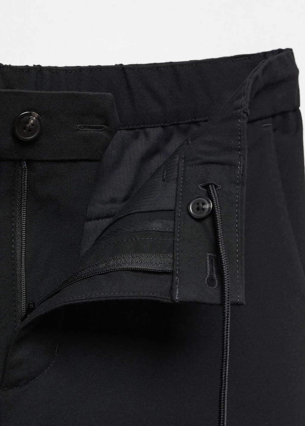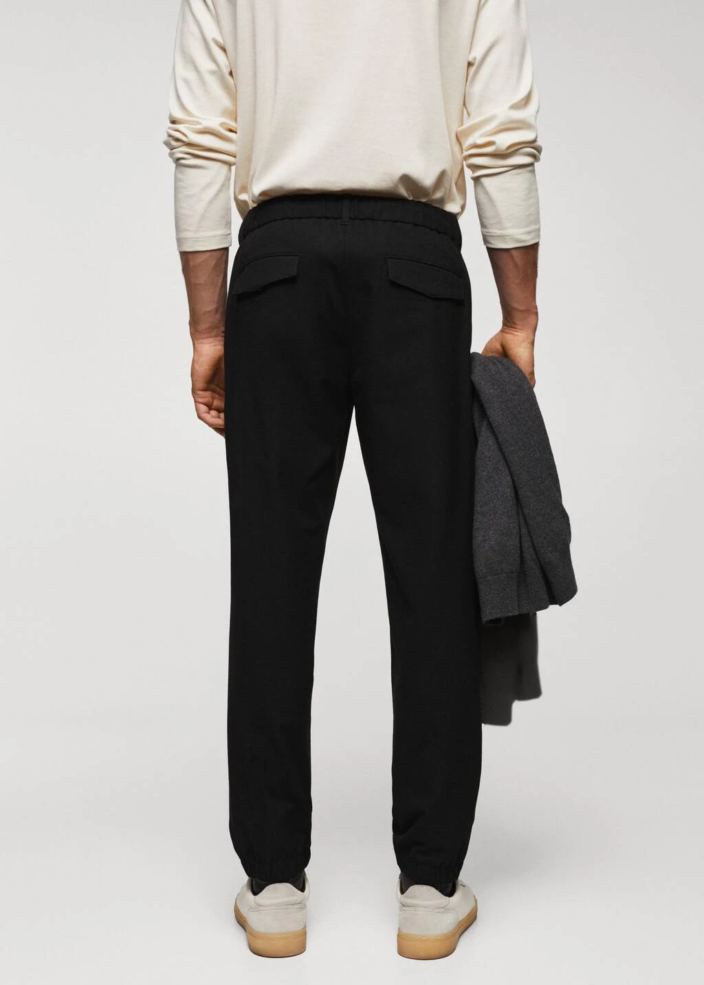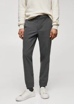 slim-fit, tissu legerement extensible, coupe jogging, double bouton et fermeture eclair, cordon interieur de serrage a la taille, passants de ceinture , deux poches avant, bas elastique, deux poches a rabat a l’arriere, le mannequin mesure 190 cm et porte une taille 42Composition: 68% polyester,28% viscose,4% elasthanne. Doublure poches: 65% polyester,35% coton