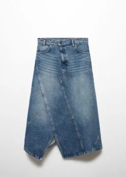 tissu en coton de style jean, coupe midi, coupe asymetrique, taille normale, deux poches laterales, poche plaquee a l’arriere, fermeture eclair avec bouton, coutures decoratives, passants pour la ceinture, total look.Composition: 100% coton