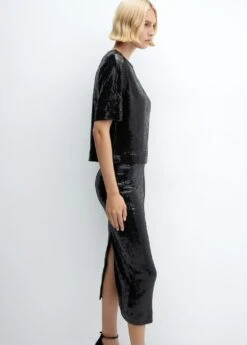 tissu en sequins, coupe midi, ajuste, sans fermeture, taille elastique, doublure, total look, collection fetes et ceremonies.Composition: 93% polyester,7% elasthanne. Doublure: 100% polyester. Sequin: 100% poly(téréphtalate d’éthylène)