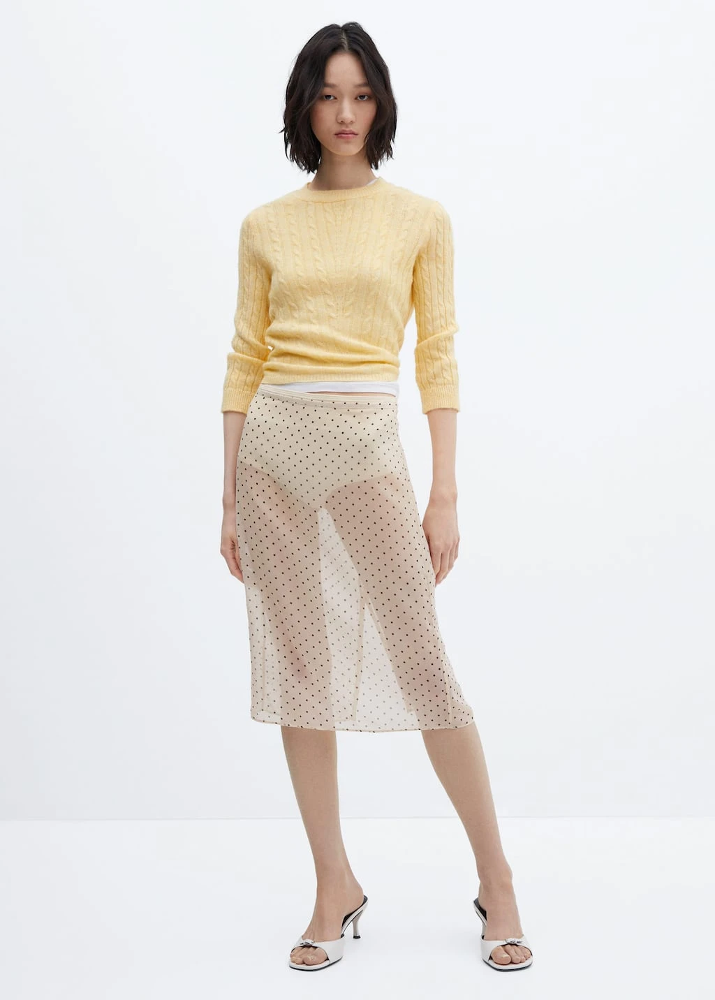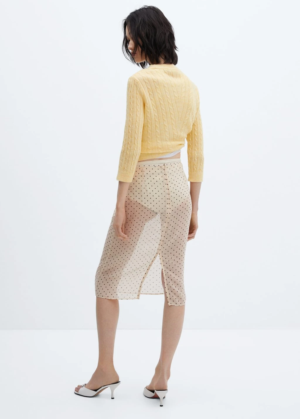 tissu semi-transparent, tissu fluide, coupe midi, coupe droite, fermeture eclair invisible a l’arriere, bas fendu a l’arriere, bord a liseres, doublure, total look, collection fetes et ceremonies, style romantiqueComposition: 100% polyester. Applique: 58% polyamide,42% elasthanne