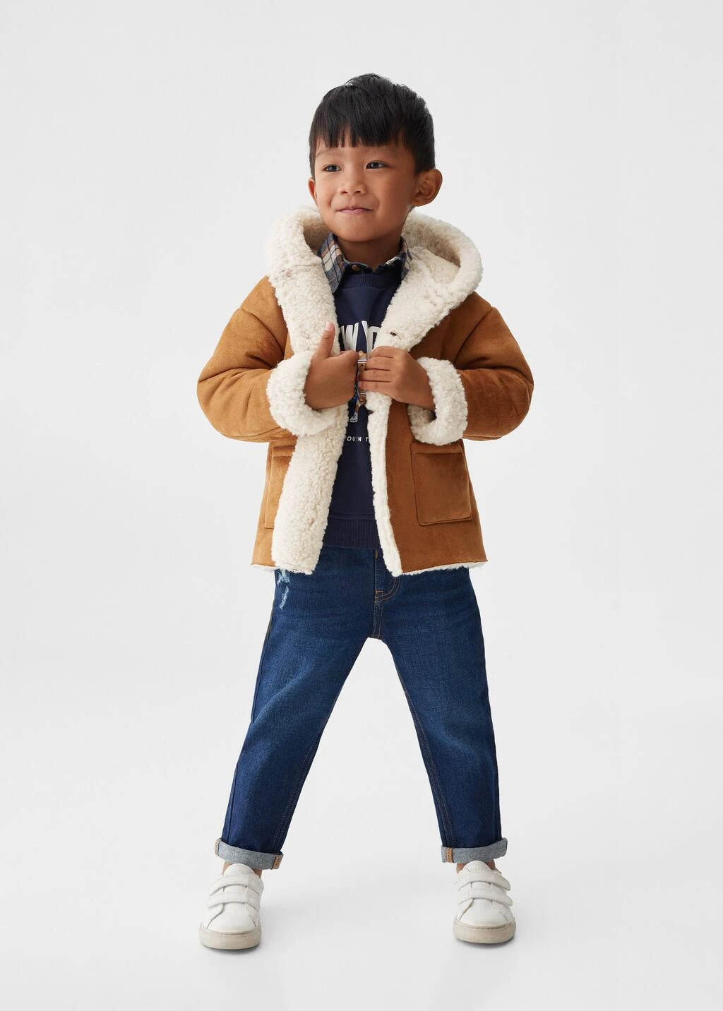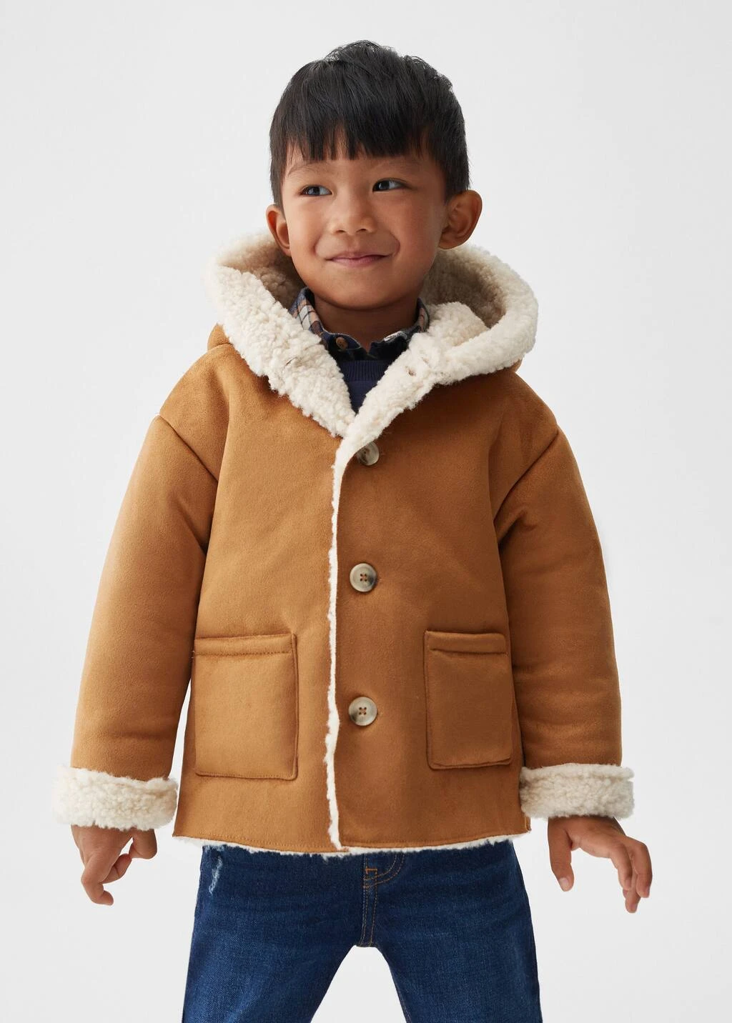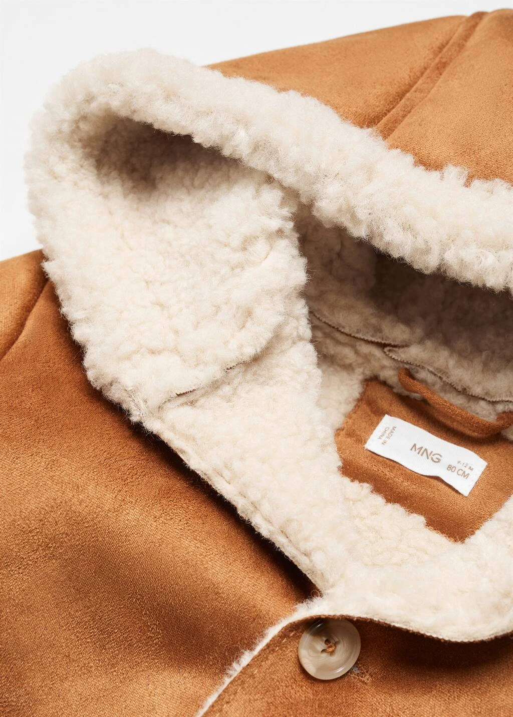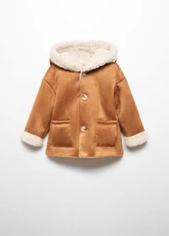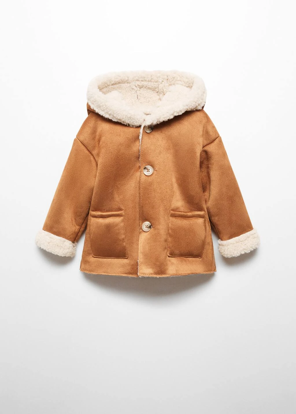 tissu suedine, droit, longueur normale, col rond, capuche, manches longues, deux poches plaquees sur les cotes, interieur moutonnee, fermeture boutonnee sur le devant, etiquette d’identite a l’interieur Composition: 100% polyester. Doublure poches: 100% polyester