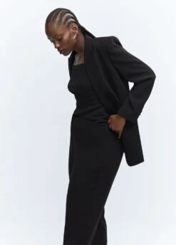 tissu fluide, coupe droite, coupe longue, fermeture eclair avec crochet et bouton dissimules, taille elastiquee a l’arriere, deux poches laterales, total look, doublure, disponible plus, collection fetes et ceremonies, le polyester recycle est obtenu a partir de dechets textiles de polyester, de dechets marins ou de bouteilles en plastique pet qui sont utilises pour produire de nouveaux tissus.Composition: 100% polyester