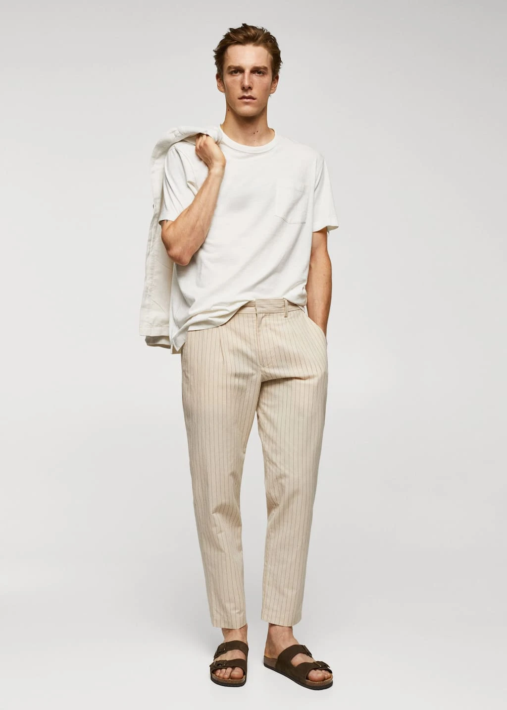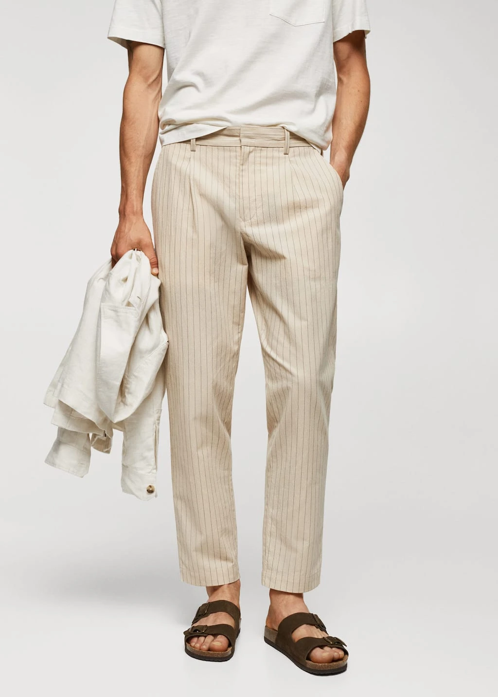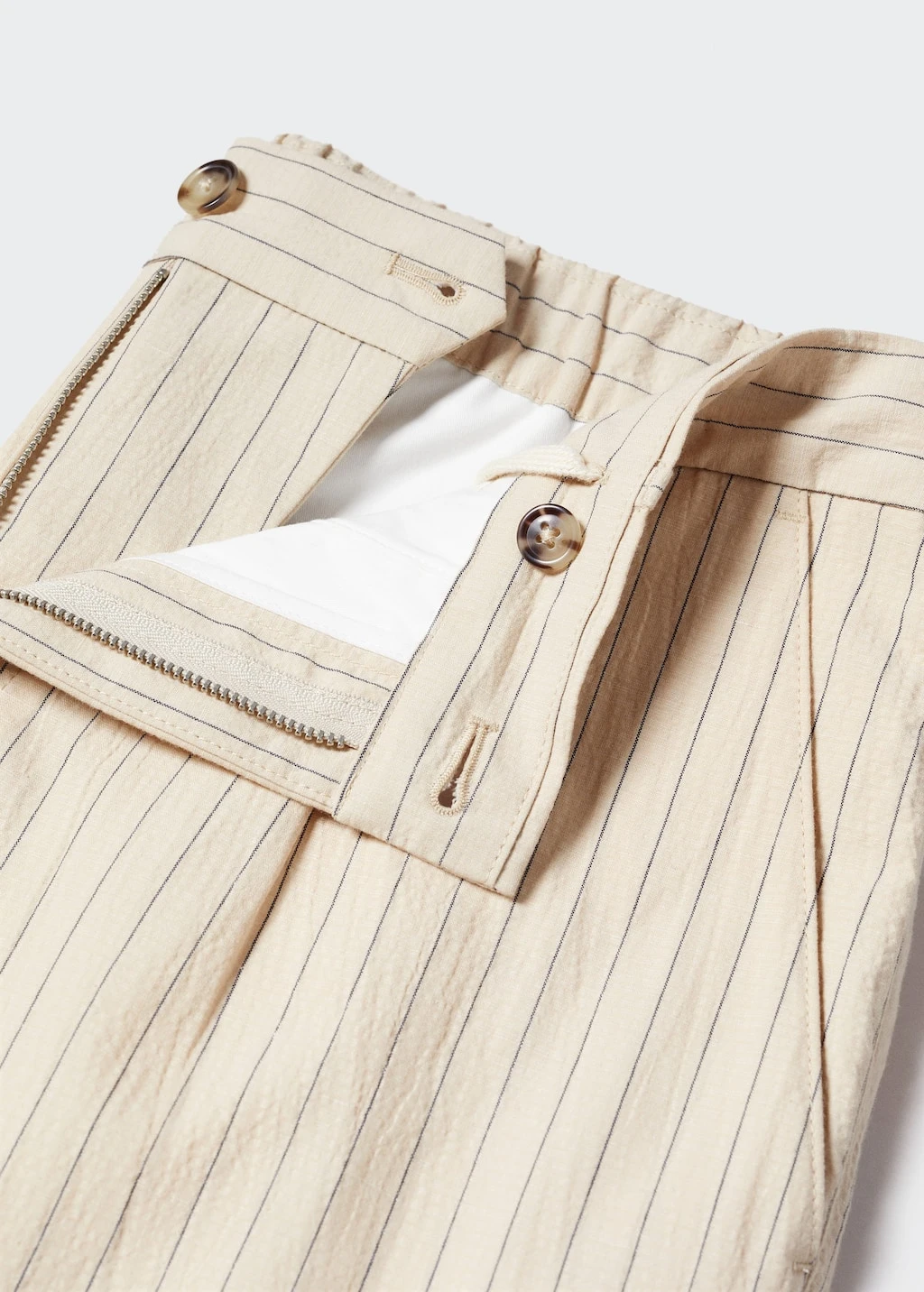 slim-fit, tissu de coton et lin melange, effet seersucker, imprime fines rayures, pinces sur le devant, double bouton et fermeture eclair, cordon interieur de serrage a la taille, deux poches avant, deux poches passepoilees a l’arriere, le mannequin mesure 190 cm et porte une taille 42Composition: 76% coton,22% lin,2% elasthanne. Doublure poches: 100% coton