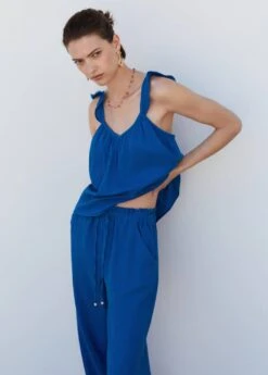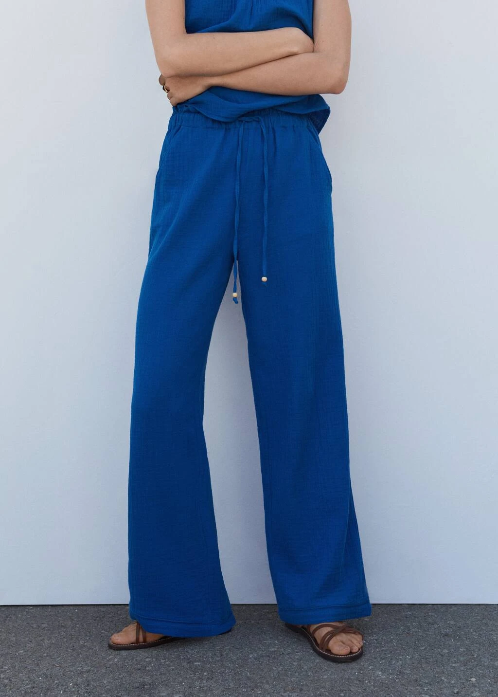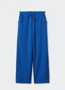 tissu 100 % coton, tissu plisse, tissu texture, coupe droite, coupe longue, deux poches laterales, taille elastiquee, fermeture a nœud reglable, total lookComposition: 100% coton