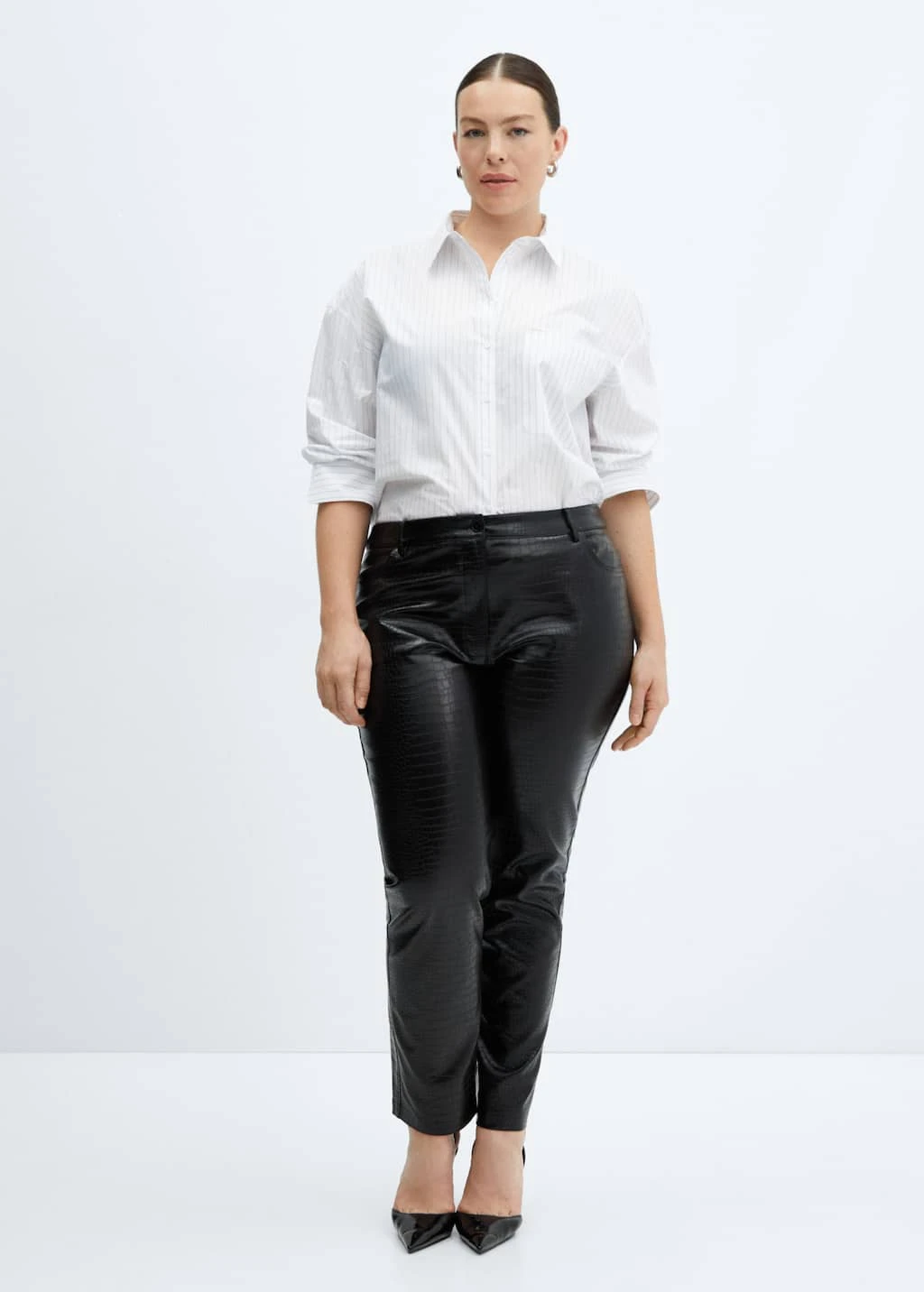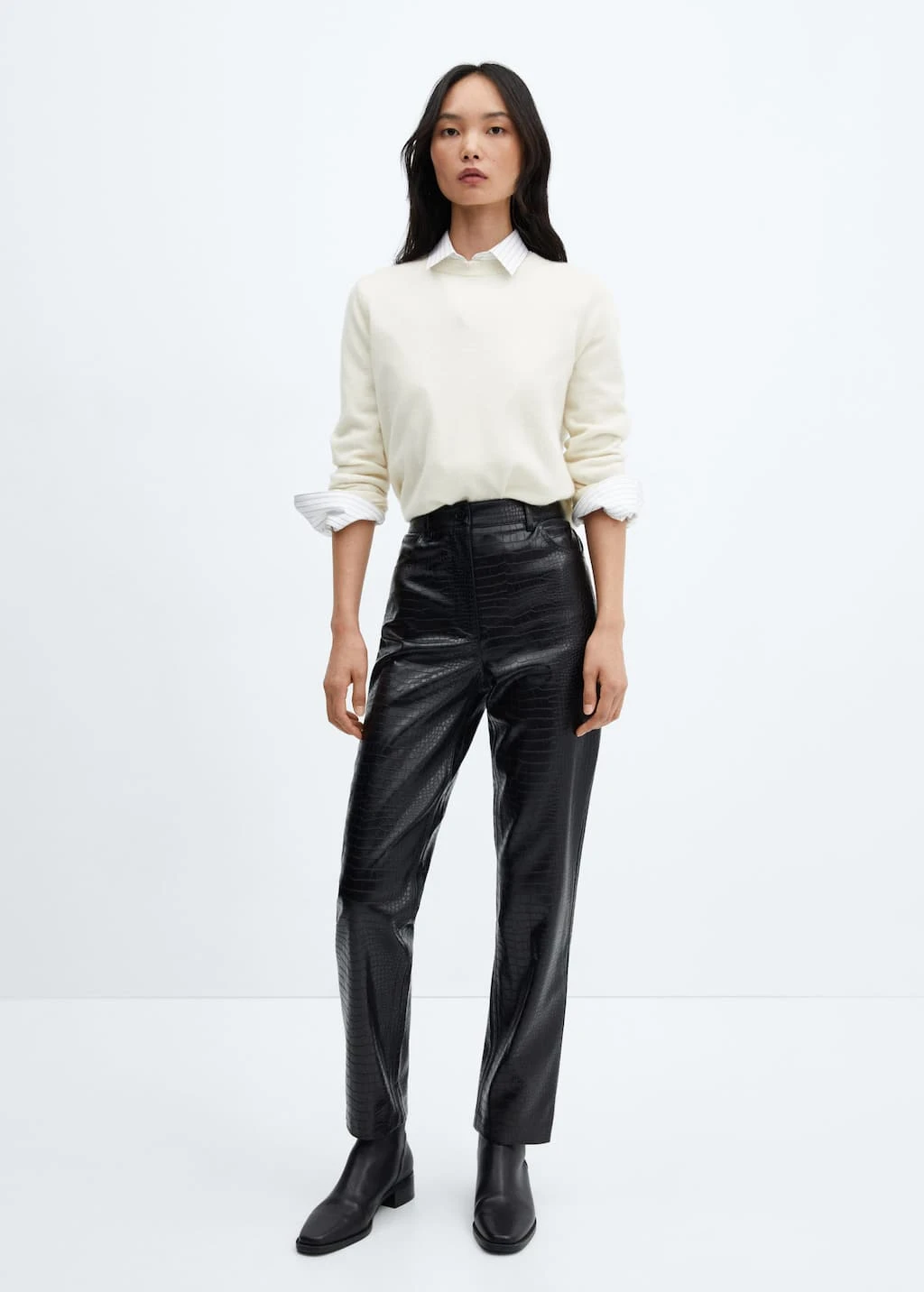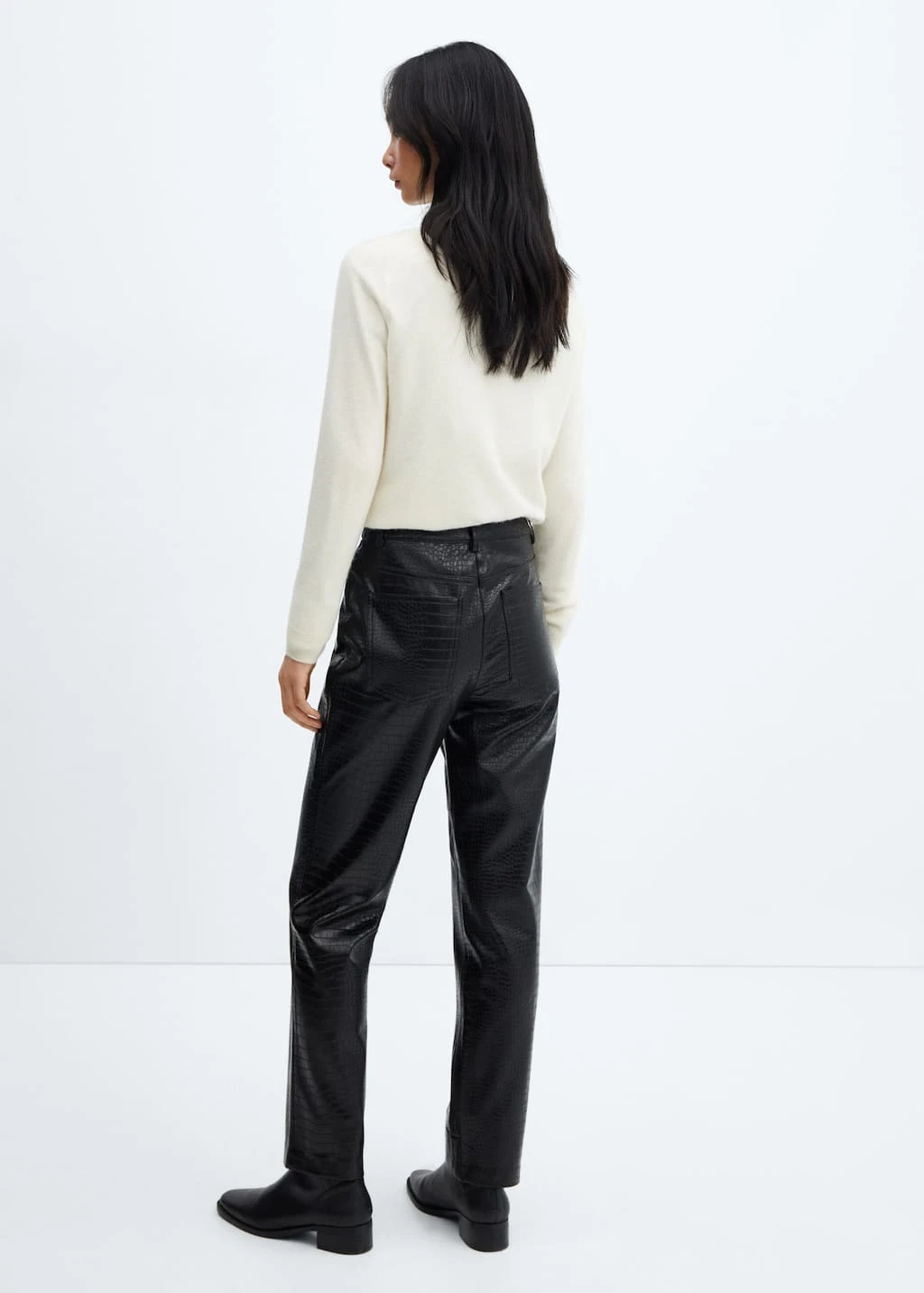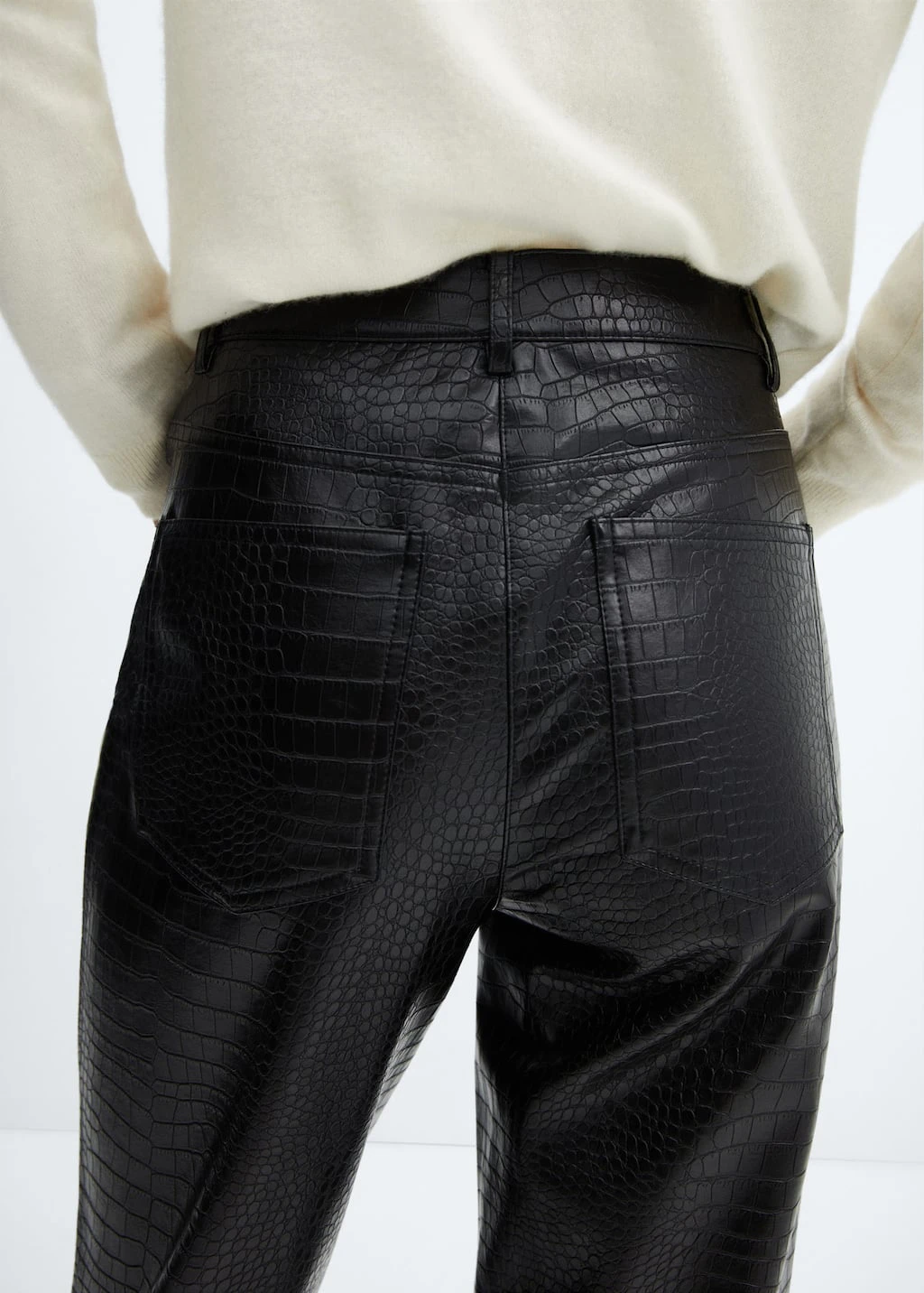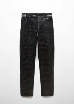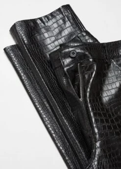 effet peau de crocodile, droit, taille normale, deux poches laterales, deux poches plaquees a l’arriere, fermeture eclair avec bouton, passants pour la ceinture, doublure, disponible plusComposition: 100% viscose. Doublure: 52% polyester,48% viscose. RevĂŞtement: 100% polyurethane