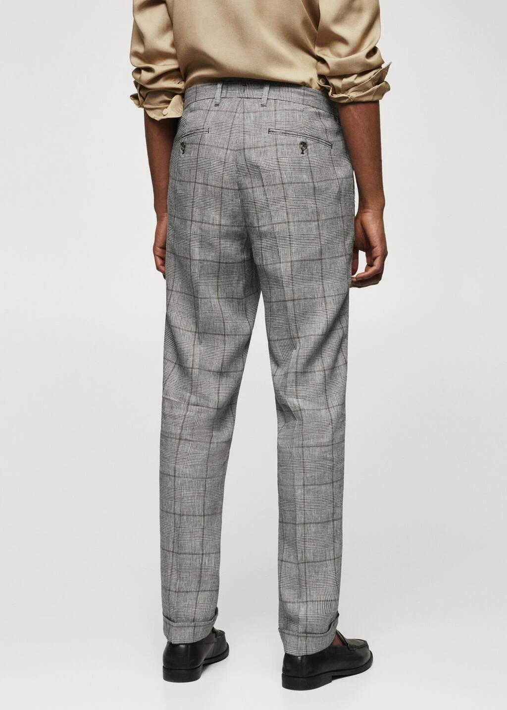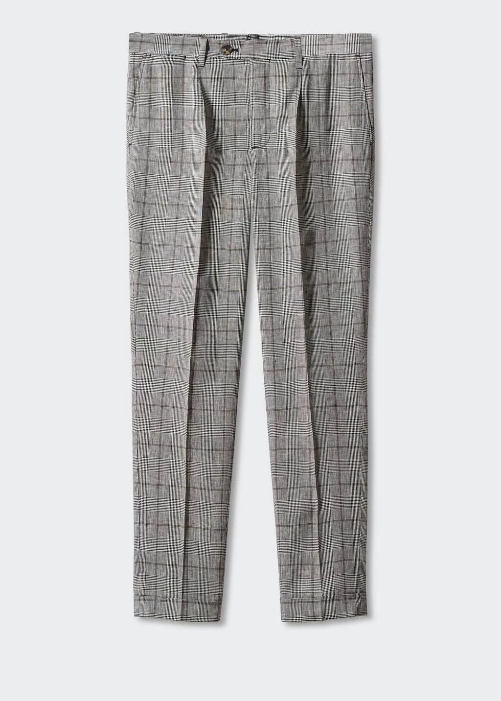 slim-fit, tissu en lin melange, tissu leger, taille normale, imprime a carreaux prince de galles, double bouton et fermeture eclair, passants de ceinture , pinces sur le devant, deux poches avant, deux poches passepoilees boutonnees a l’arriere, pince a l’arriere, revers, le mannequin mesure 187 cm et porte une taille 42Composition: 60% lin,40% viscose. Doublure poches: 100% coton
