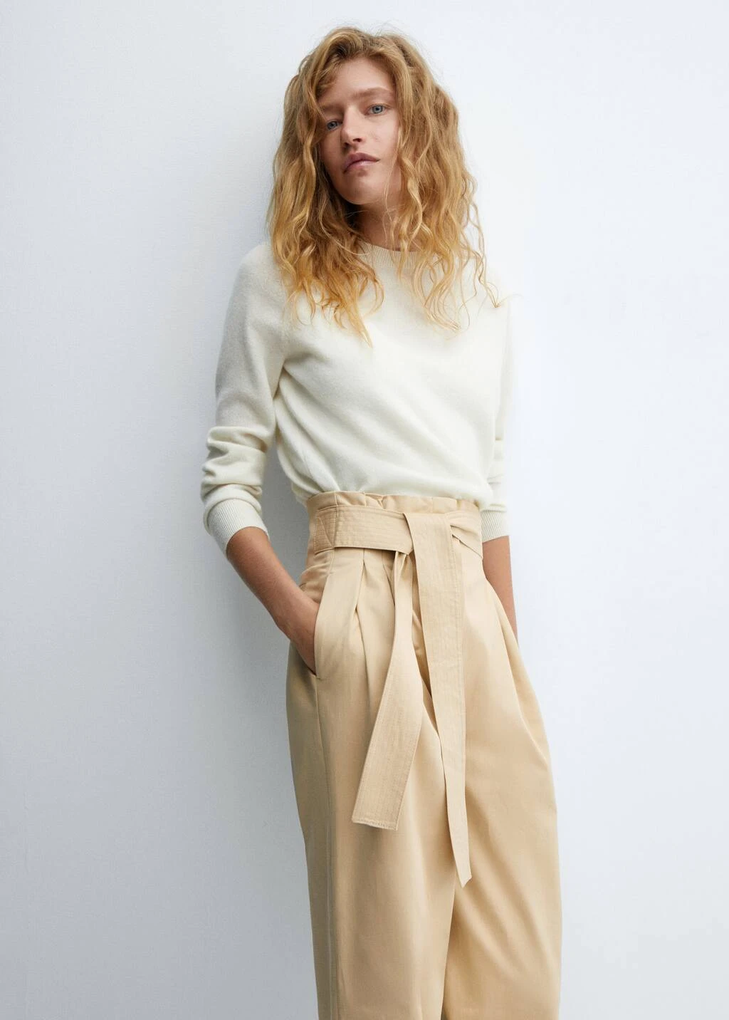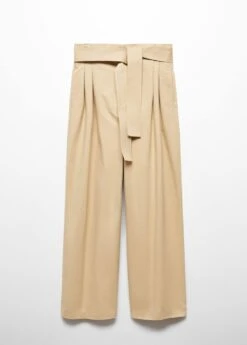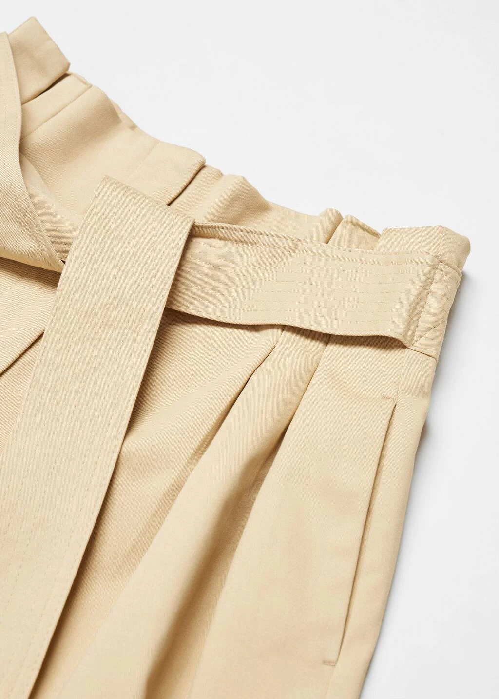 tissu de coton melange, droit, coupe longue, taille haute, coupe paper bag, deux poches laterales, deux poches passepoilees a l’arriere, fermeture eclair avec crochet, ruban a la taille avec fermeture a nĆud, coutures decorativesComposition: 98% coton,2% elasthanne