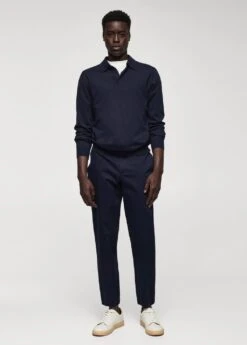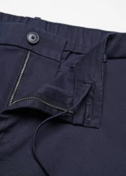 tissu de coton legerement extensible, slim-fit, fermeture eclair avec bouton, cordon interieur de serrage a la taille, taille elastiquee a l’arriere, passants de ceinture , deux poches laterales, bas elastique a l’arriere, le mannequin mesure 190 cm et porte une taille 42Composition: 98% coton,2% elasthanne. Doublure poches: 65% polyester,35% coton