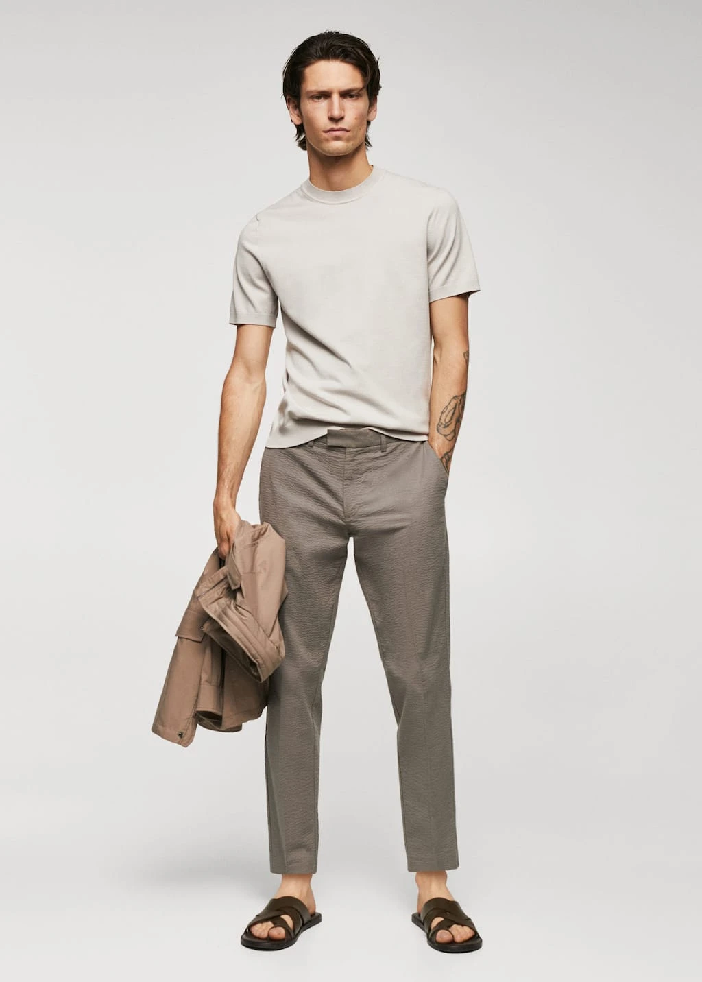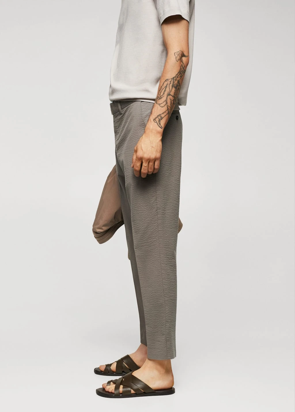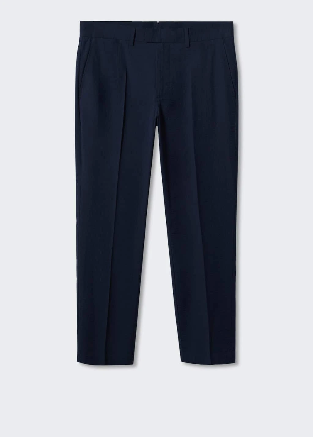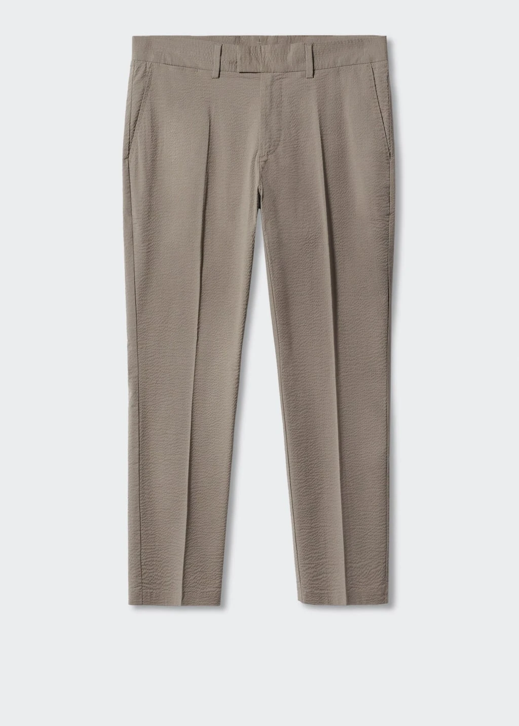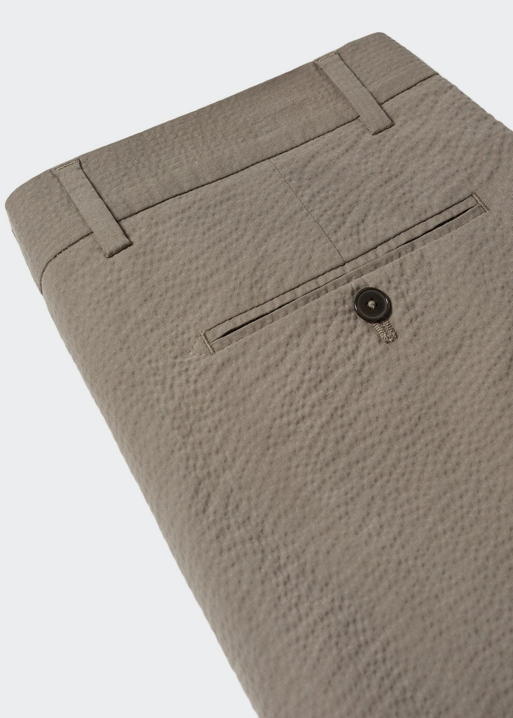 tissu en coton, slim-fit, tissu seersucker, pinces sur le devant et a l’arriere, double bouton et fermeture eclair, passants de ceinture , deux poches laterales, deux poches arriere avec bouton, bi-stretch : tissu a elasticite bidirectionnelle pour plus de confort, le mannequin mesure 190 cm et porte une taille 42Composition: 97% coton,3% elasthanne. Doublure poches: 65% polyester,35% coton