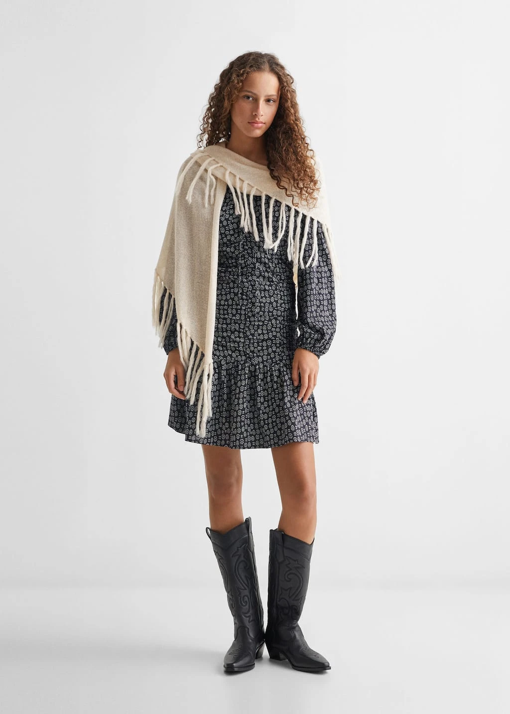 tissu en maille, coupe longue, detail frange, sans fermetureComposition: 53% acrylique,40% polyamide,7% laine