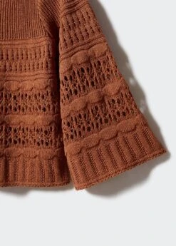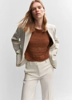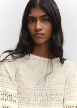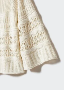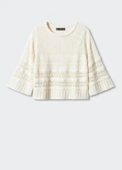 tissu en maille, coupe droite, col rond, bordures festonnees, manches longues cloche, sans fermeture, details ajouresComposition: 55% viscose,30% polyester,15% lin