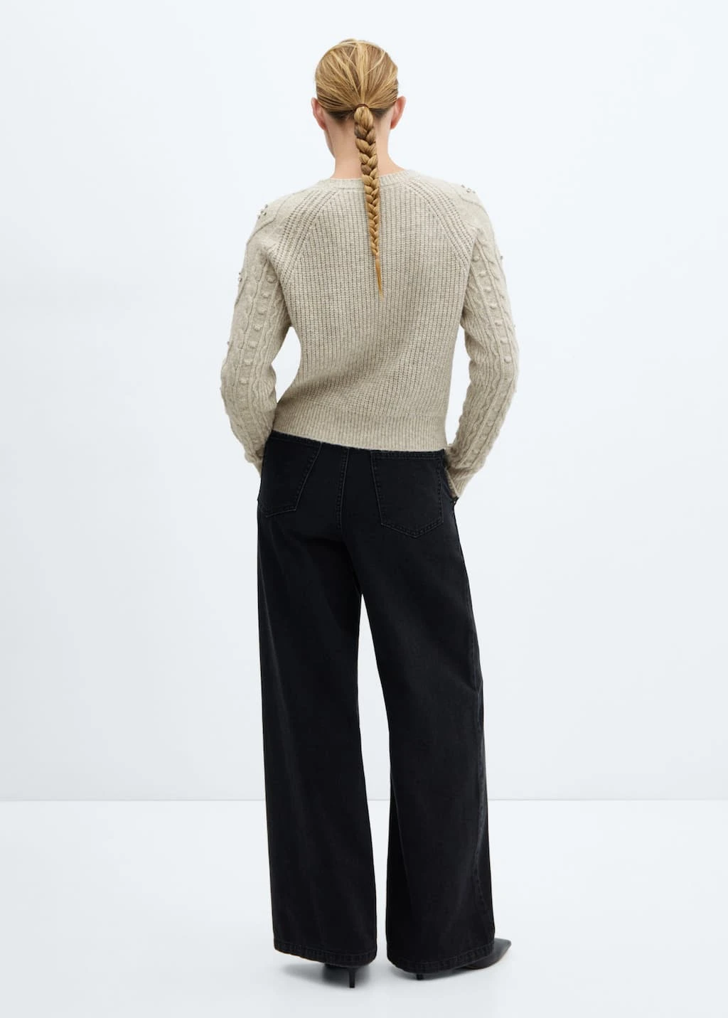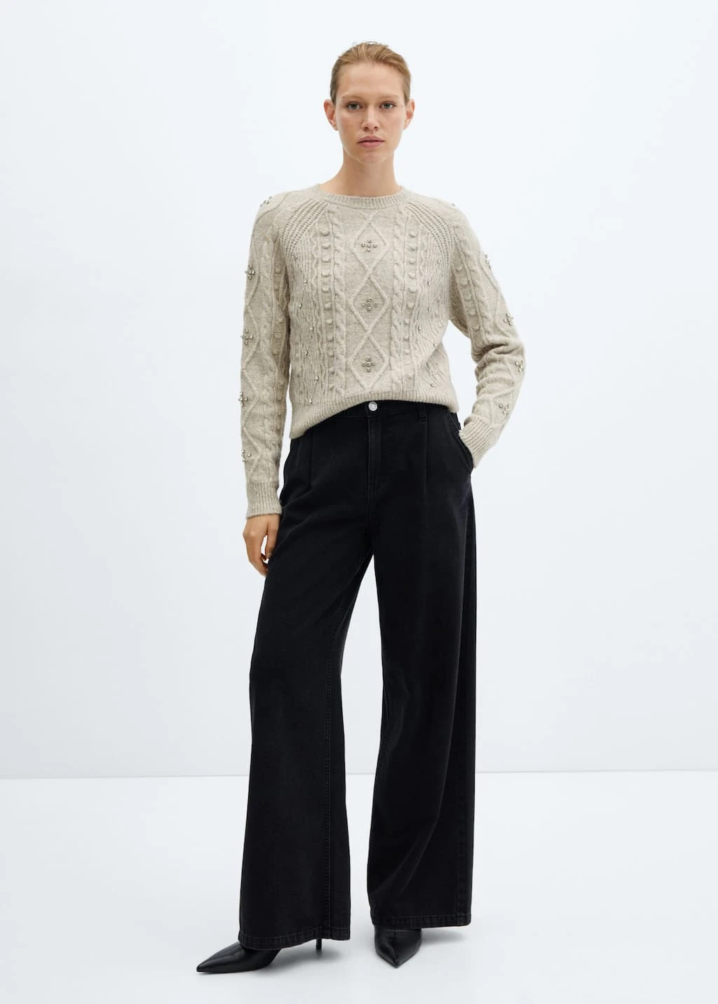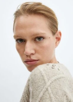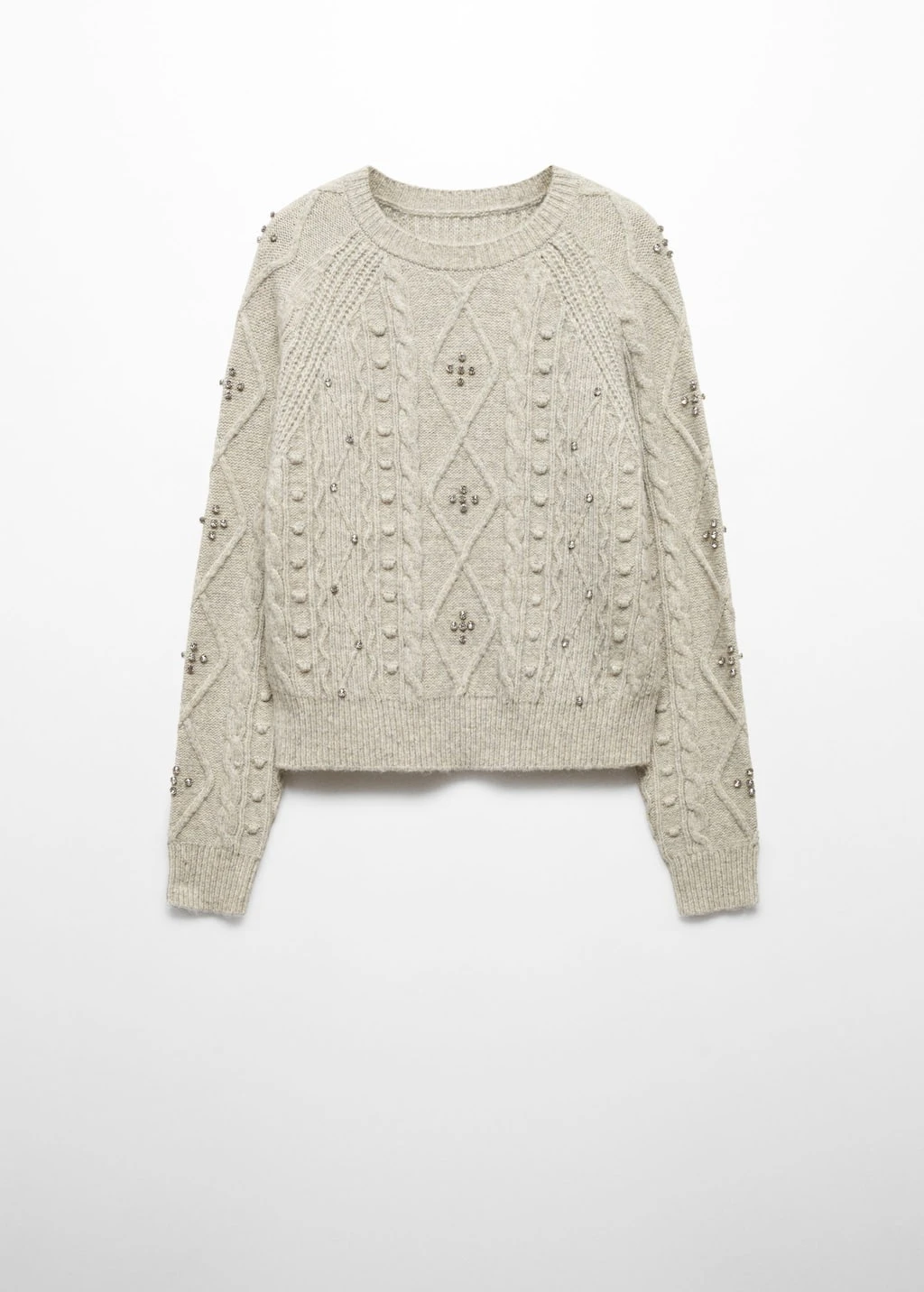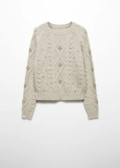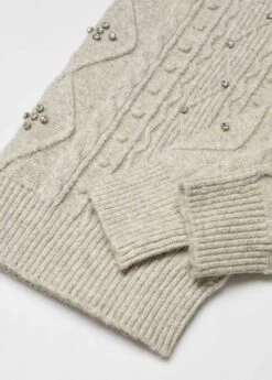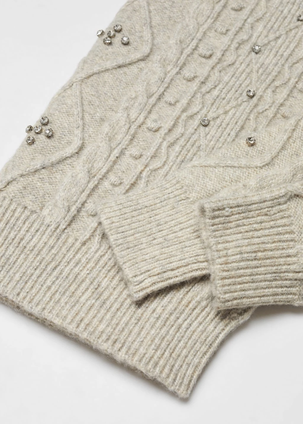 tissu de laine melange, tissu en grosse maille, maille torsadee, coupe droite, col rond, manches longues, sans fermeture, bords coteles au niveau du col, des manches et sur le bas, ornements decoratifs brillantsComposition: 80% polyester,7% laine,7% polyamide,6% acrylique
