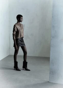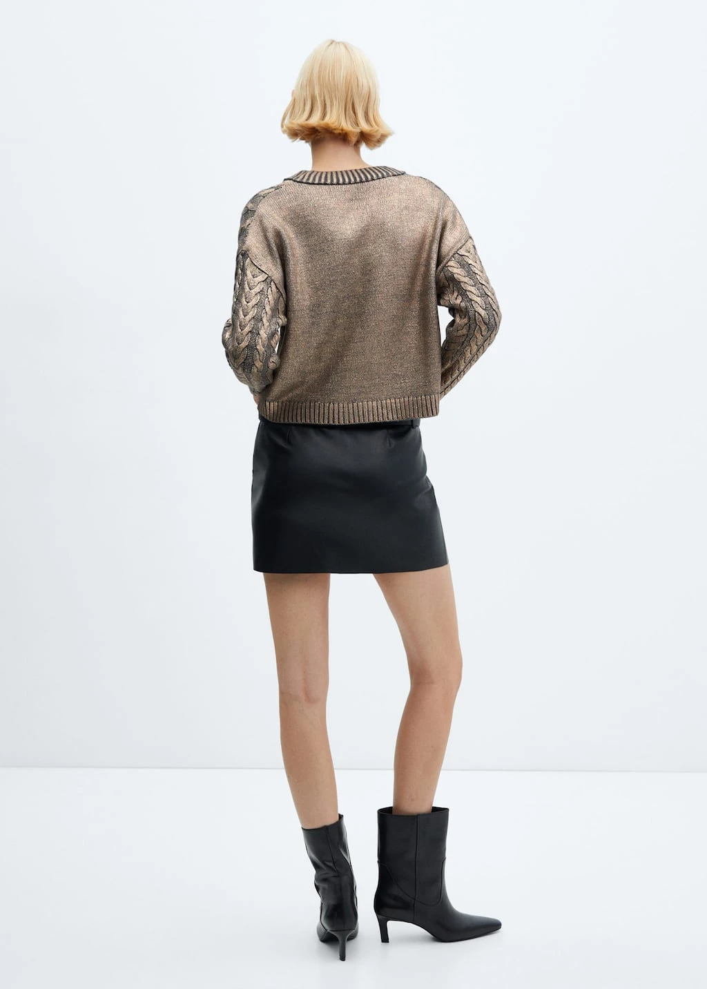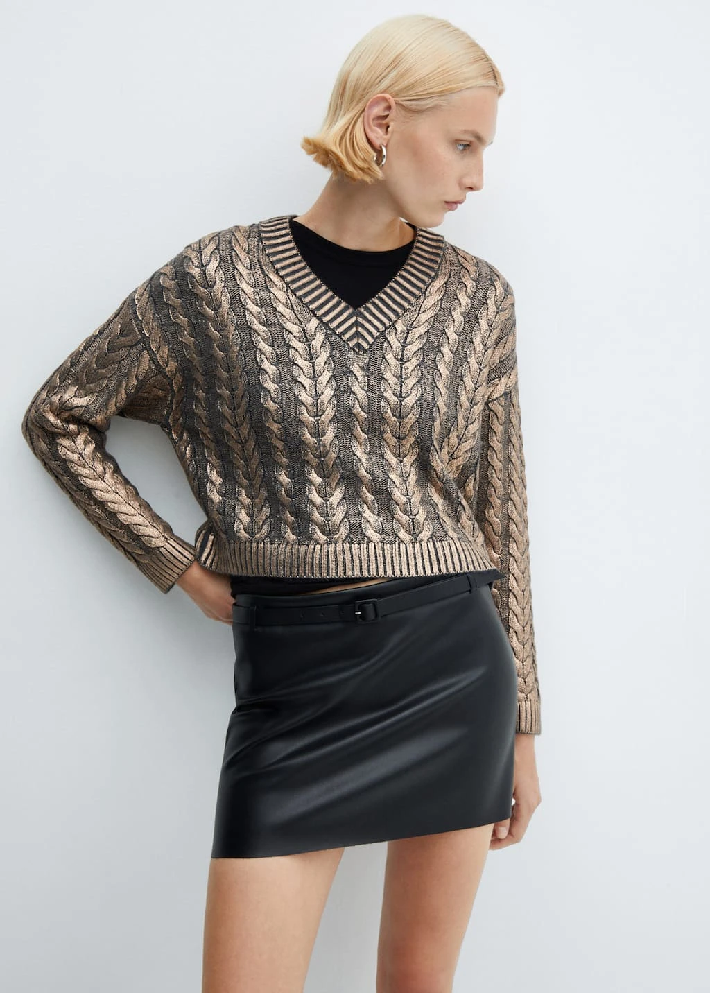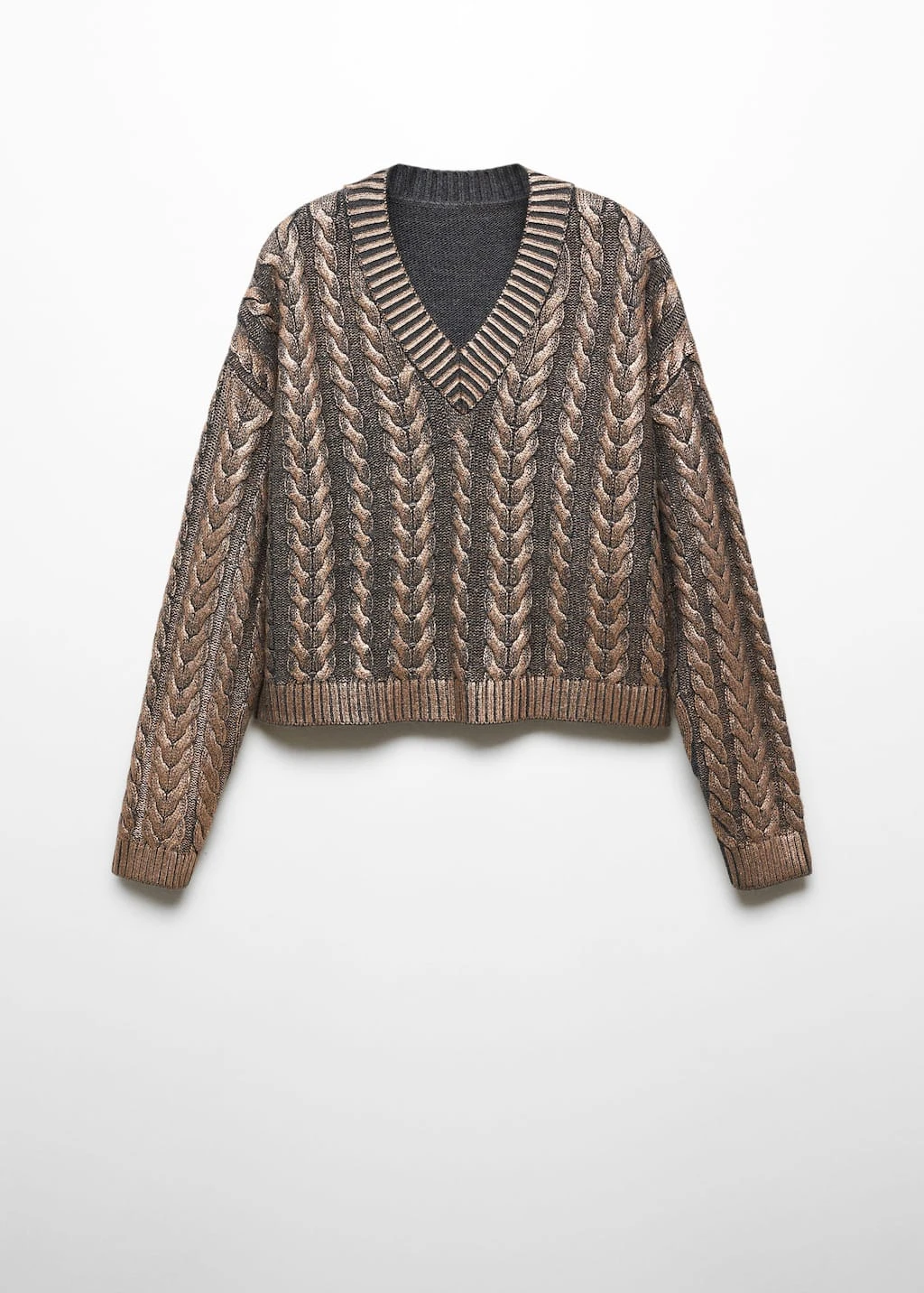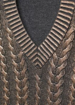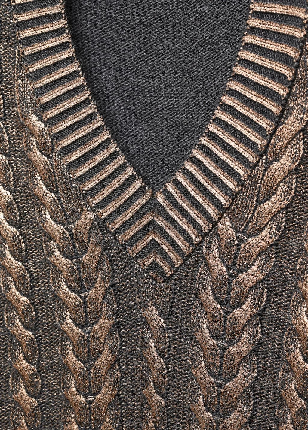tissu maille torsadee, finition metallisee, droit, col en v, manches longuesComposition: 100% acrylique