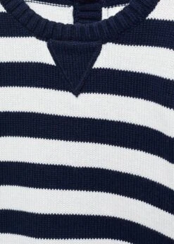 100 % coton, tissu en grosse maille, coupe droite, imprime rayures, fermeture au niveau du col, col rond, manches longues, bouton de fermeture a l’arriereComposition: 100% coton