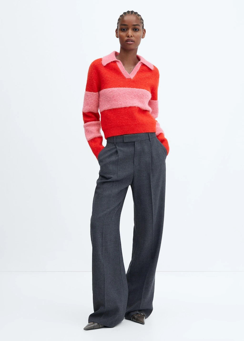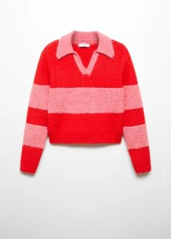 maille moyenne, coupe droite, col polo, col en v, manches longues, empiecement contrastant, bords cotelesComposition: 54% acrylique,28% polyester,16% polyamide,2% elasthanne