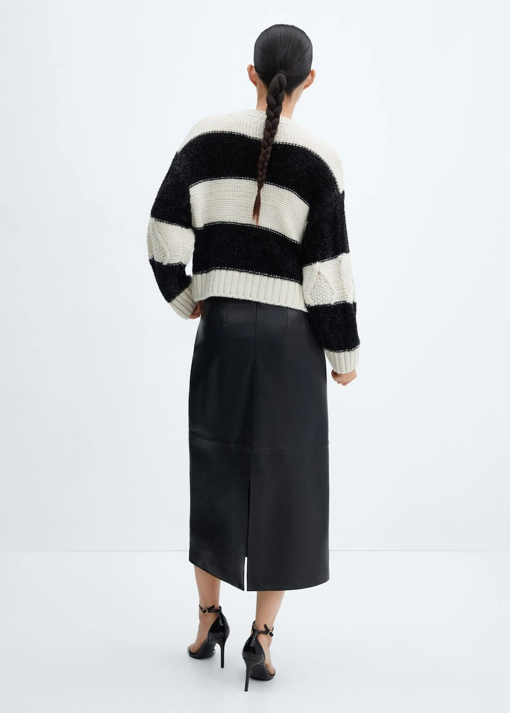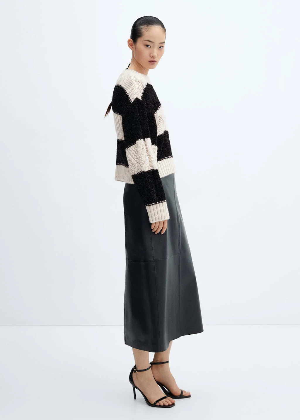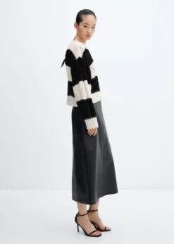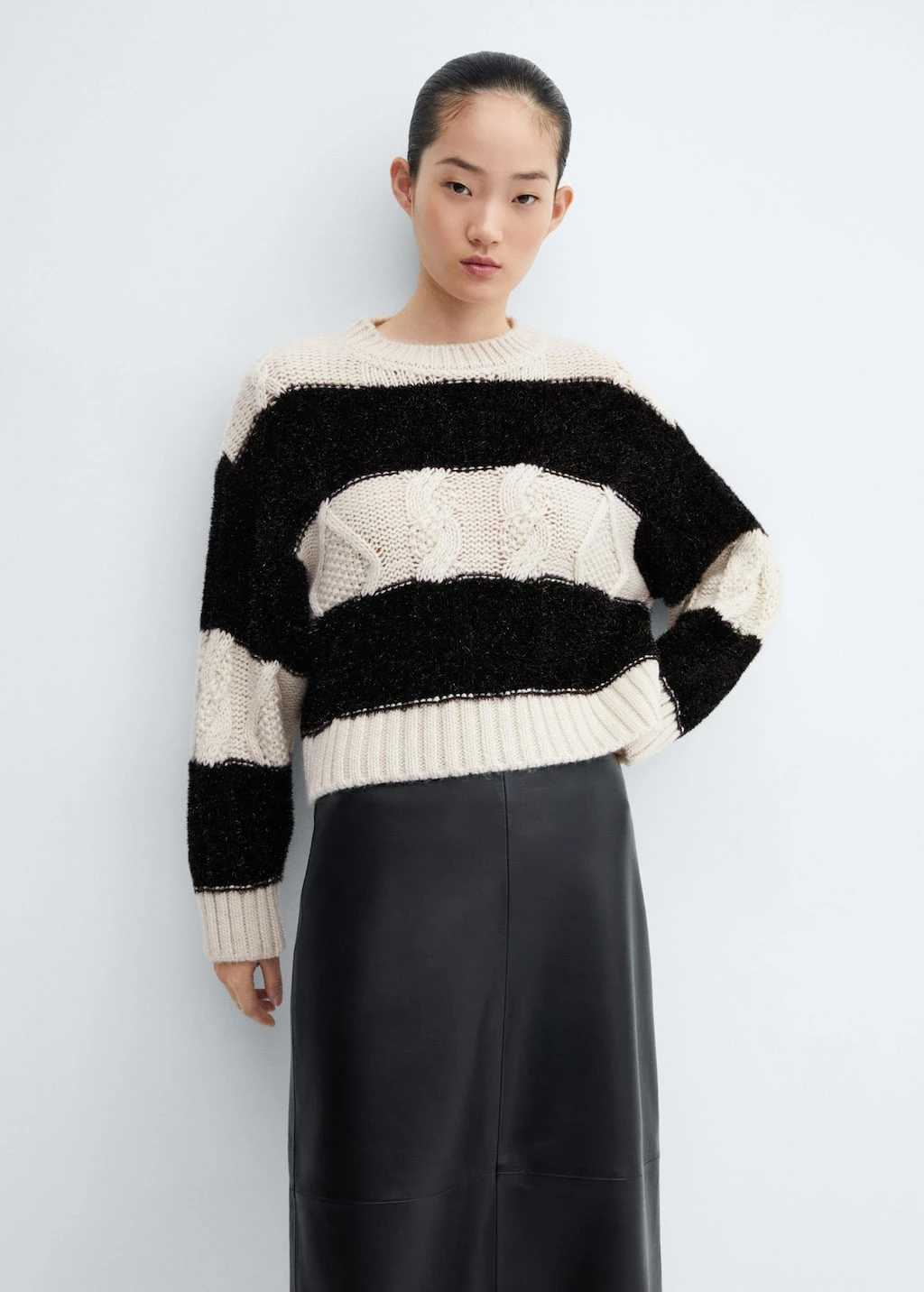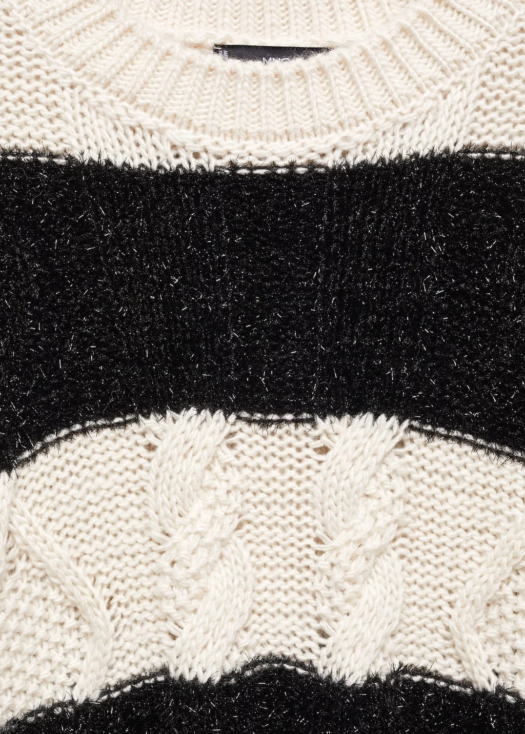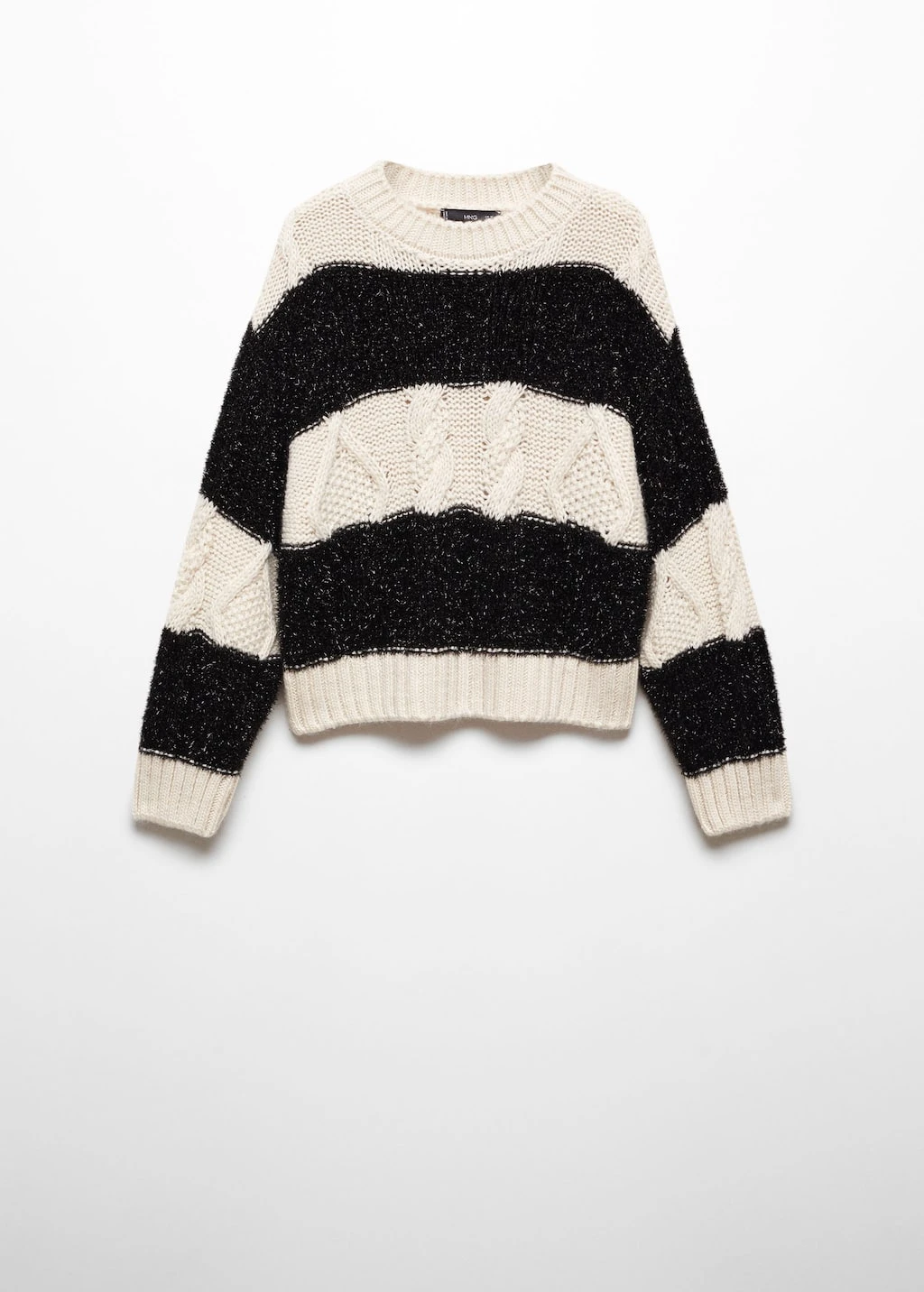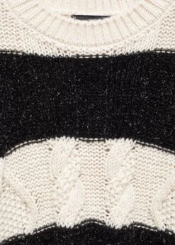 tissu en grosse maille, maille torsadee, imprime rayures, coupe droite, col rond, manches longues, empiecements contrastants, empiecements en tissu textureComposition: 46% acrylique,26% polyester,23% polyester avec revĂŞtement de cuivre,5% laine