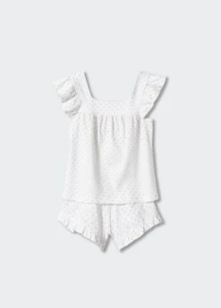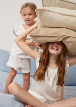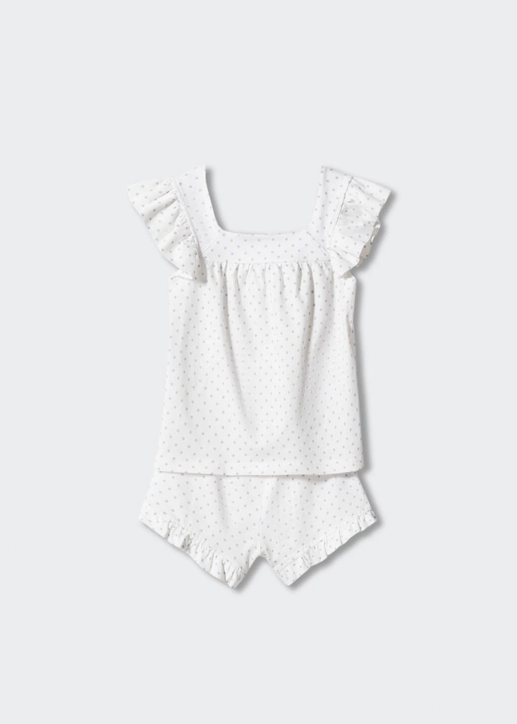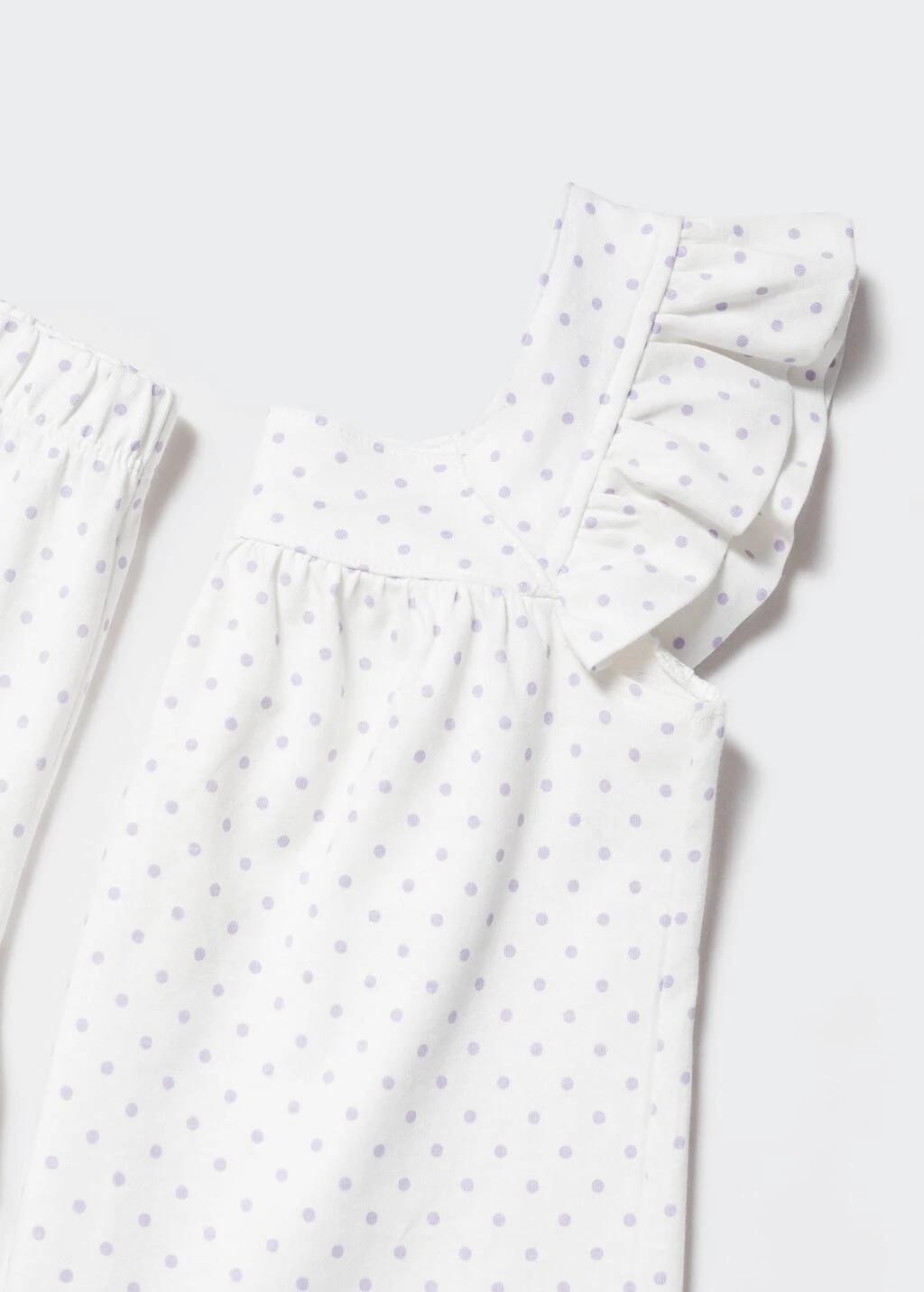 pack t-shirt et pantalon de pyjama, 100 % coton, imprime a pois, coupe courte, bretelles larges, bretelles a volant, base volantee, col carre, sans manches, avec ce vetement en coton, vous soutenez notre investissement dans la mission de better cotton. ce tissu est un equilibre de masse qui remplace ou melange du coton better cotton avec du coton conventionnel, aussi il est possible quâil ne contienne pas de better cotton. les agriculteurs partenaires beneficient d’un soutien et d’une formation continus.COMPOSITION:100% COTON. PANTALON:100% COTON