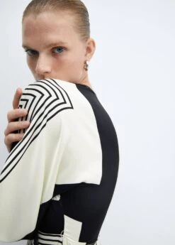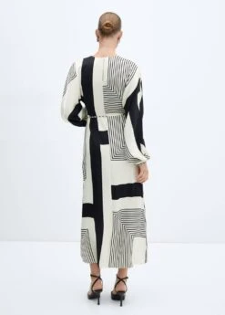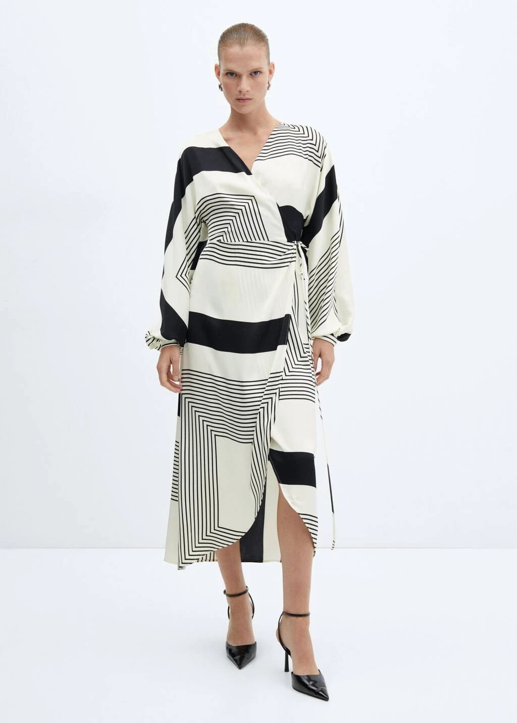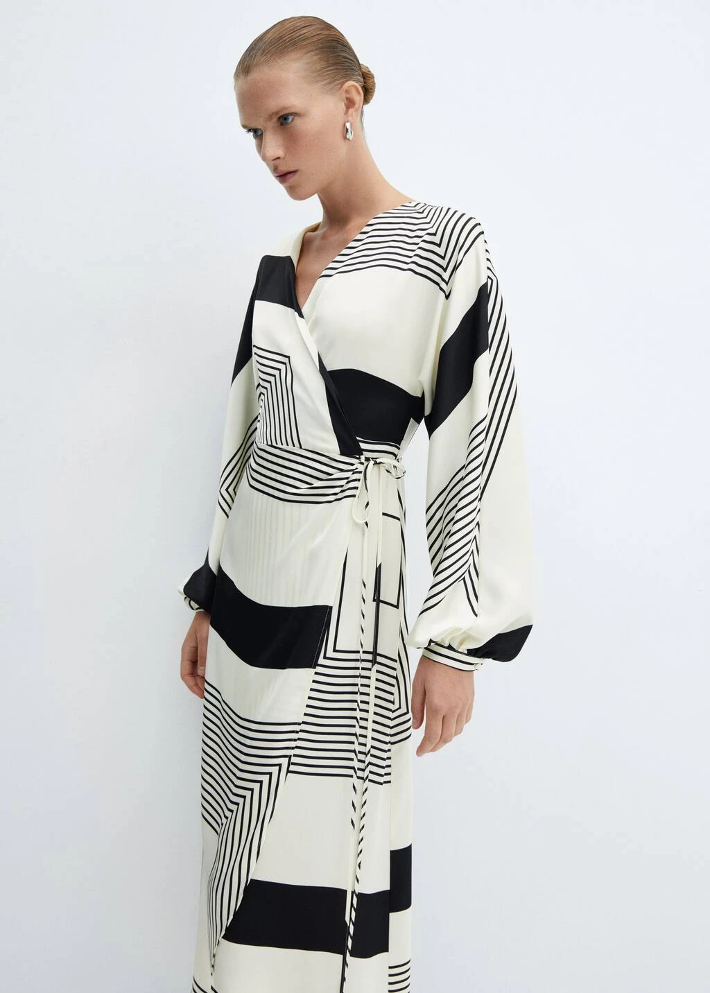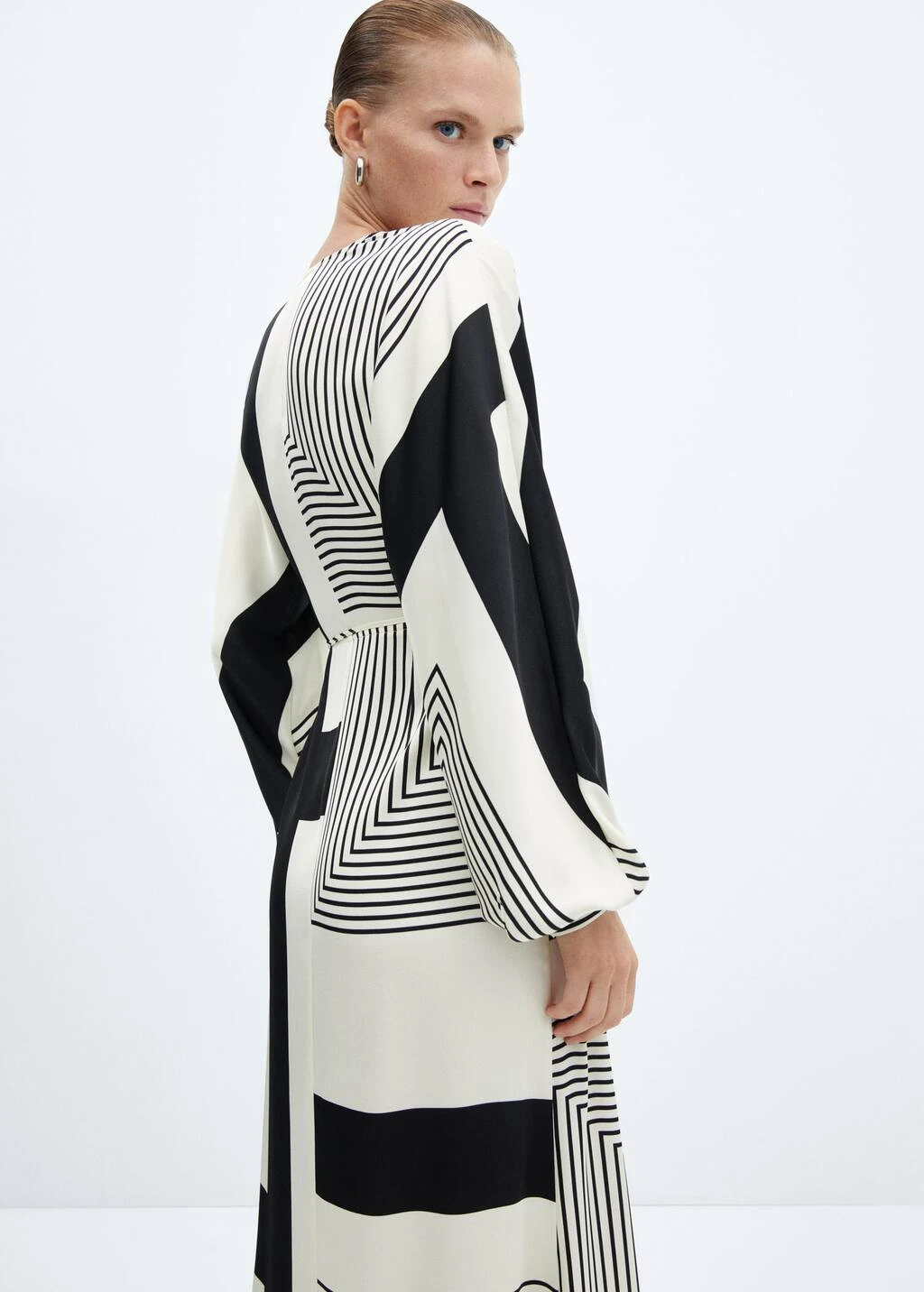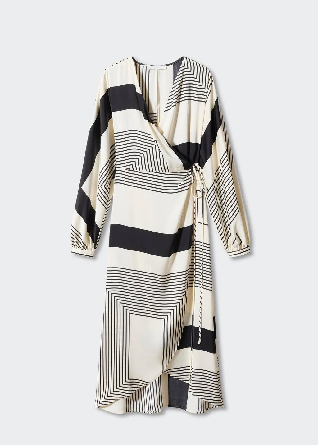 tissu fluide, croise, coupe longue, imprime geometrique, manches longues, nœud a la tailleComposition: 100% polyester