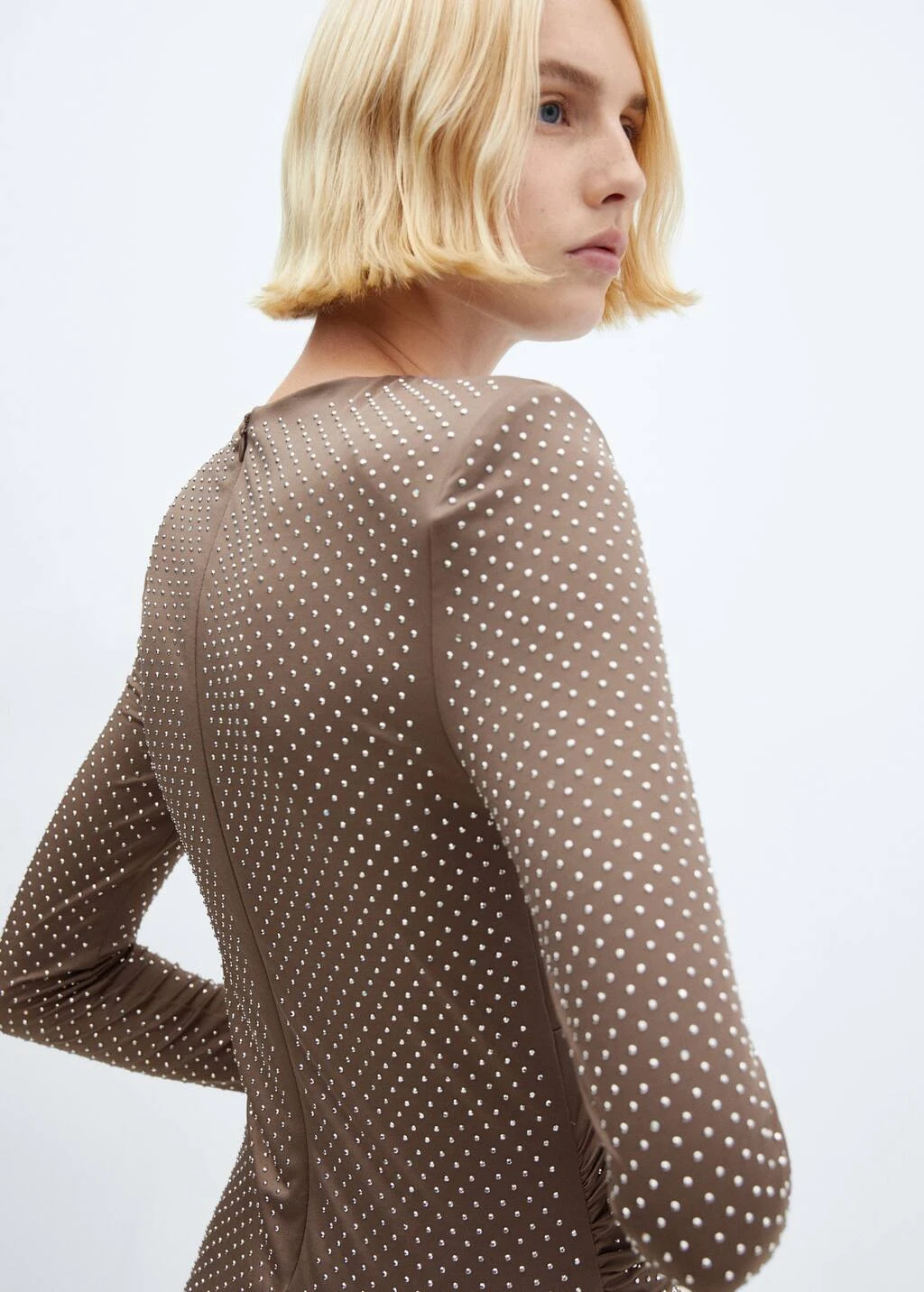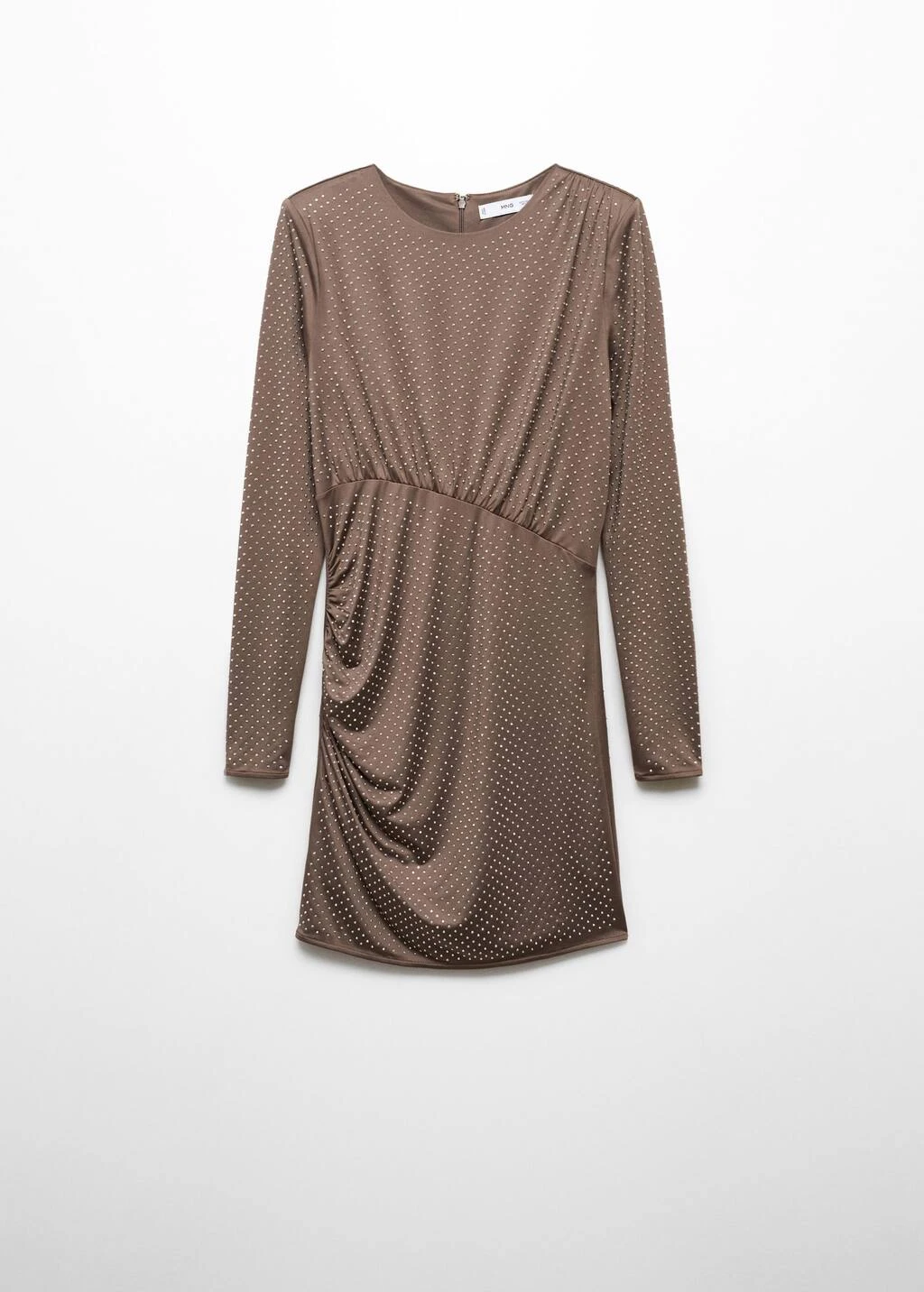 tissu fluide, tissu elastique, coupe courte, coupe cintree, col rond, manches longues, fermeture eclair a l’arriere, detail en strass, fronces laterales , doublure, collection fetes et ceremonies.Composition: 95% polyester,5% elasthanne. Doublure: 95% polyester,5% elasthanne. Sequin: 100% verre