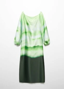 tissu satine, effet degrade, coupe longue, droit, col bateau, epaules denudees, manches longues bouffantes, fente laterale en bas, collection fetes et ceremoniesComposition: 71% polyester,29% elasthanne