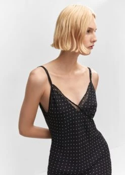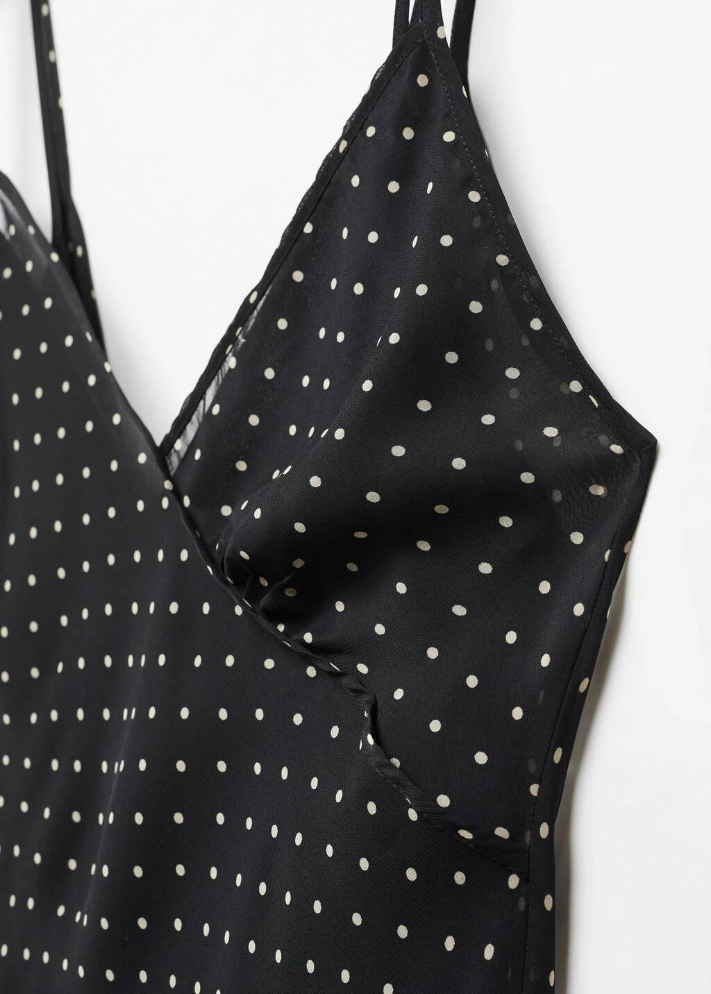 tissu en gaze, tissu fluide, croise, coupe asymetrique, droit, coupe midi, imprime pois, col echancre, bretelles fines doubles, sans fermeture, bas asymetrique, doublureComposition: 100% polyester. Doublure: 100% polyester. Lisiere: 100% polyester