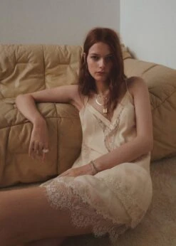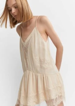tissu fluide, style lingerie, droit, coupe courte, col en v, bretelles fines, decollete en v dans le dos, detail dentelle, bas evase, style bohoComposition: 100% polyester. Doublure: 100% polyester. Dentelle: 100% polyamide