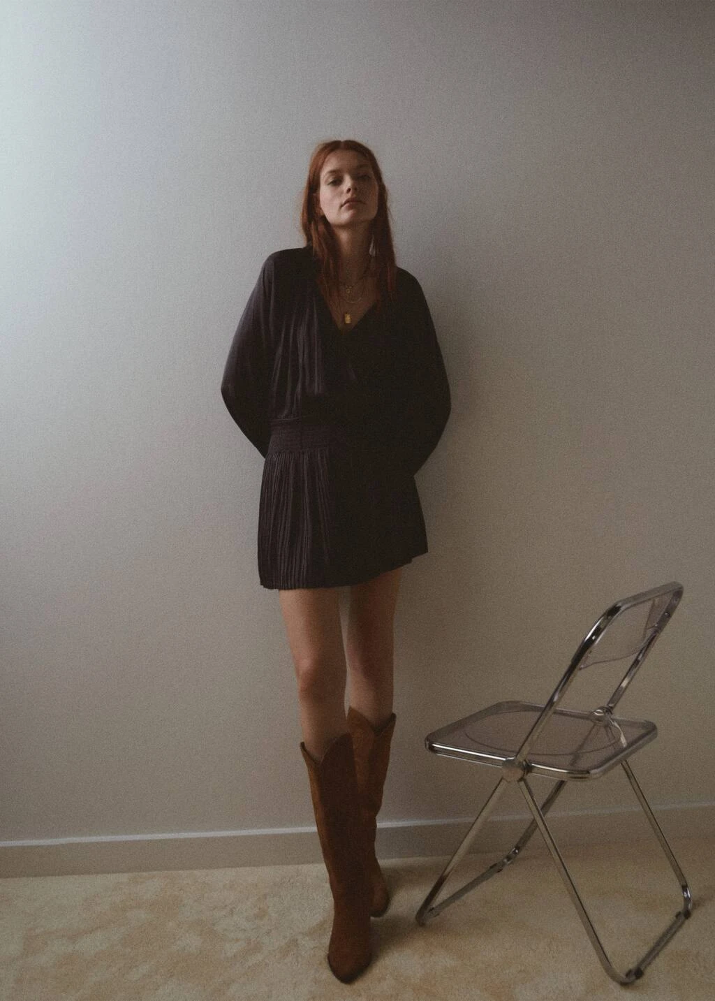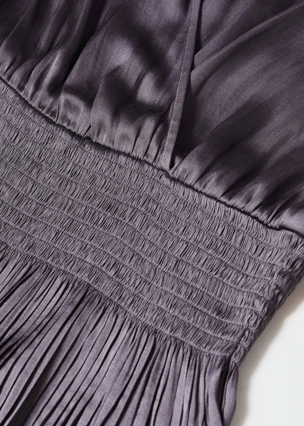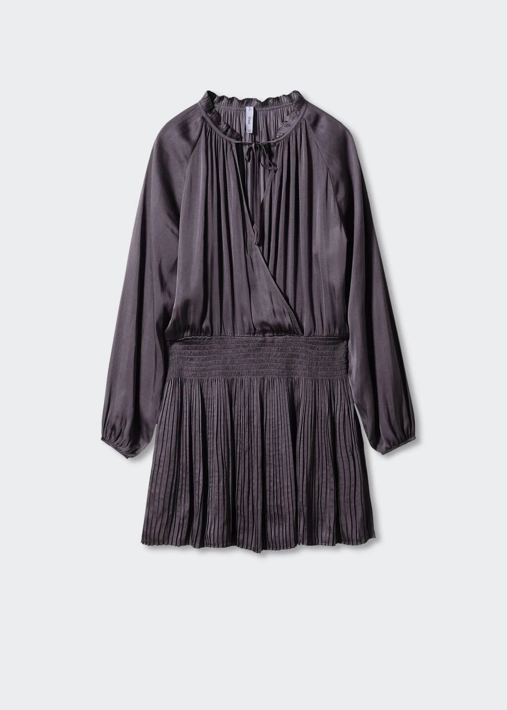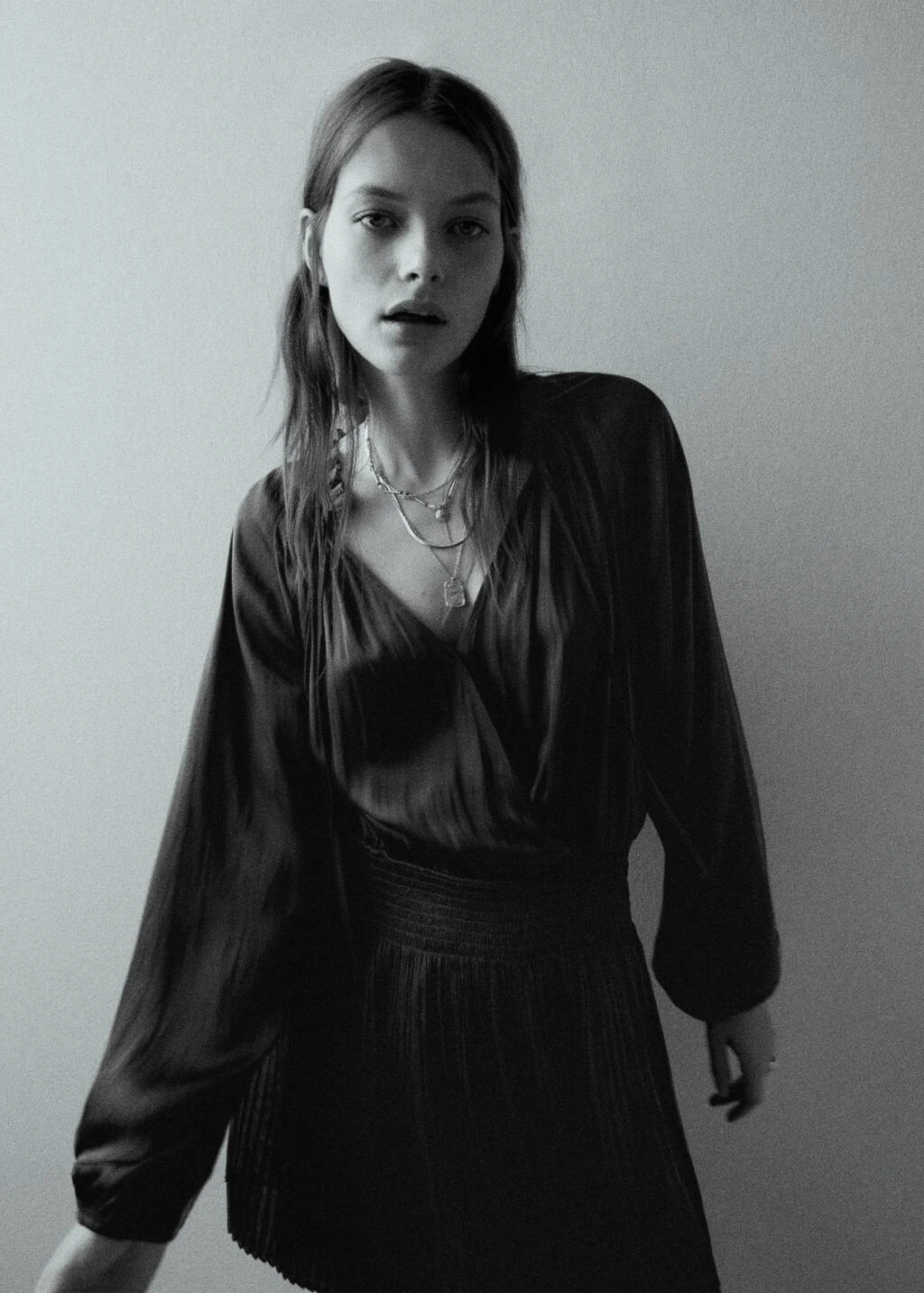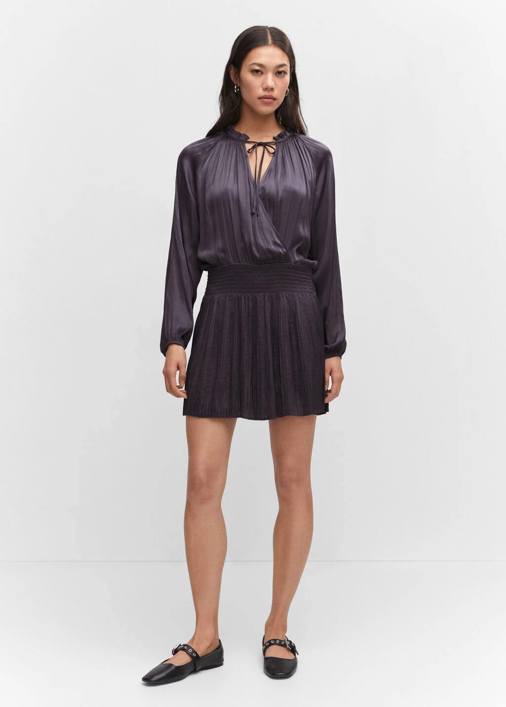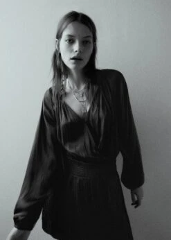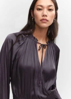 tissu satine, tissu fluide, croise, droit, coupe courte, col croise, col en v a nœud, manches longues bouffantes, poignets elastiques, taille elastiquee, sans fermeture, doublure, style bohoComposition: 100% polyester. Doublure: 100% polyester