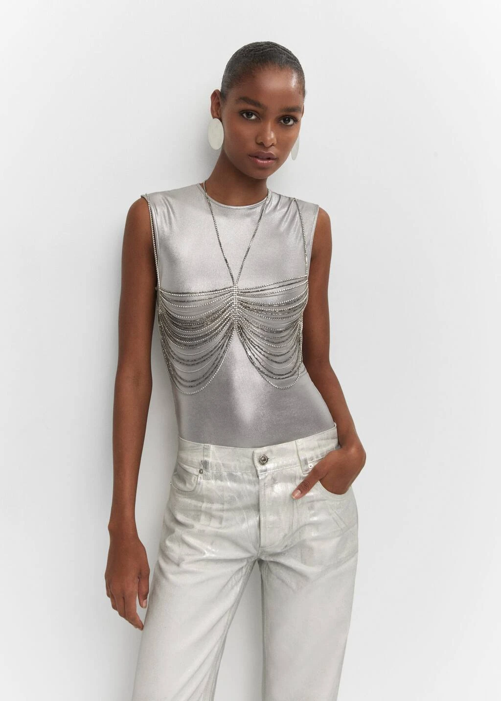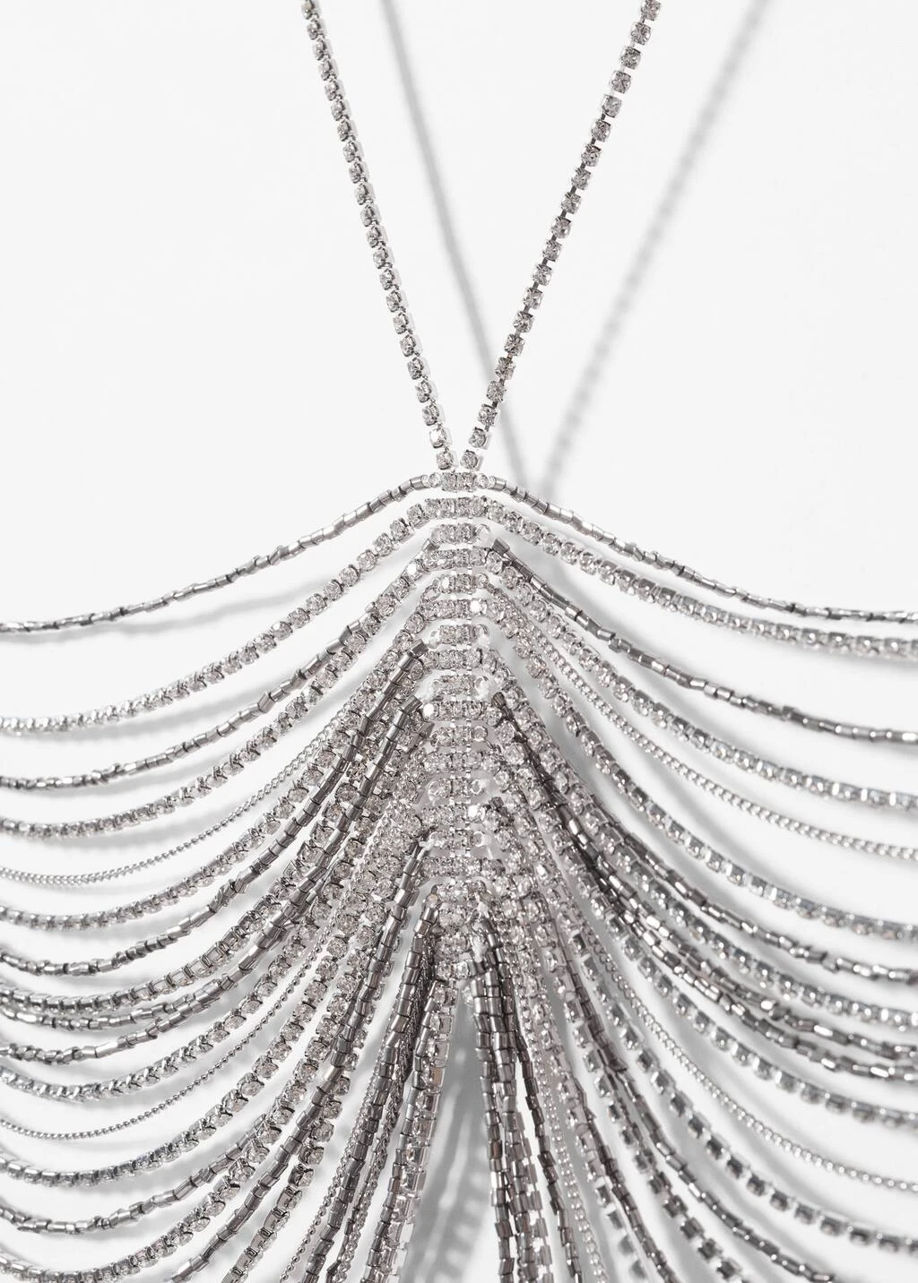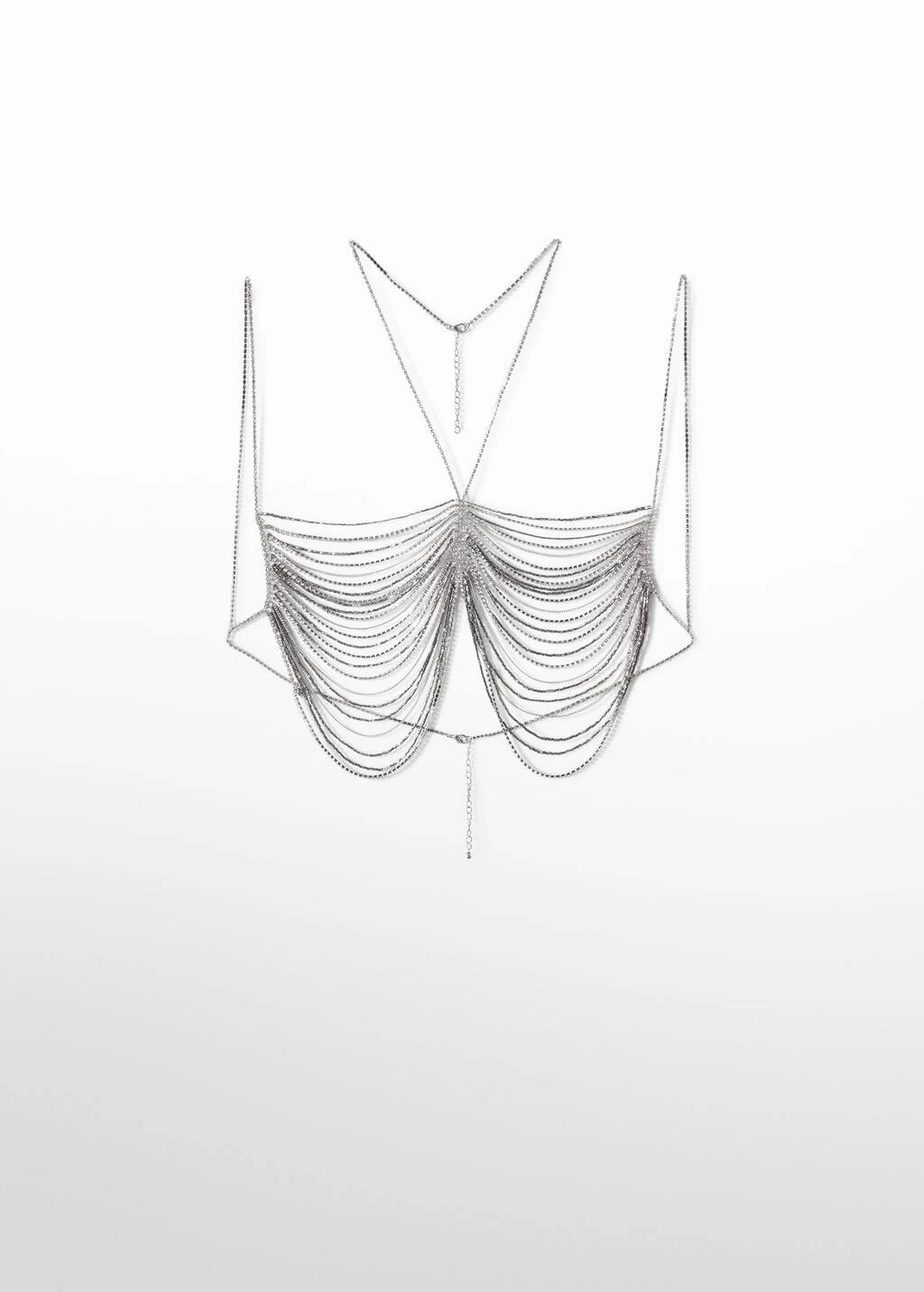 motif en strass, emmanchures americaines, fermoir a chainette et mousqueton, collection fetes et ceremoniesComposition: 30% fer,30% verre,20% laiton,10% zinc,5% acrylique,5% polyester