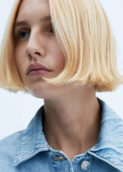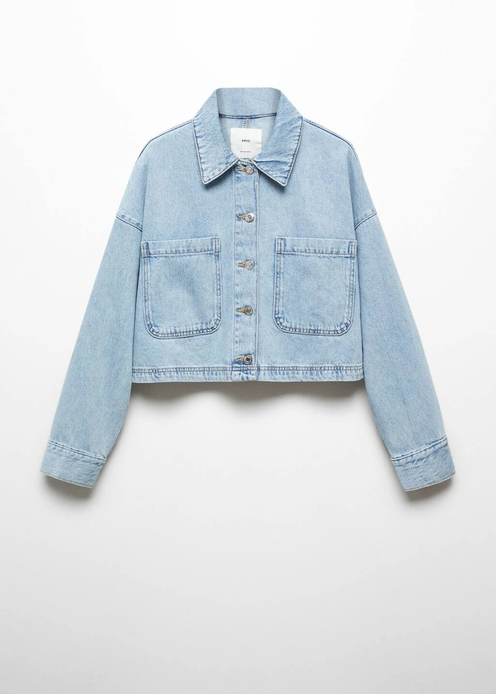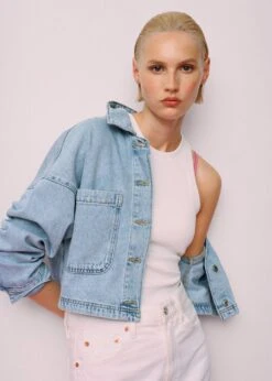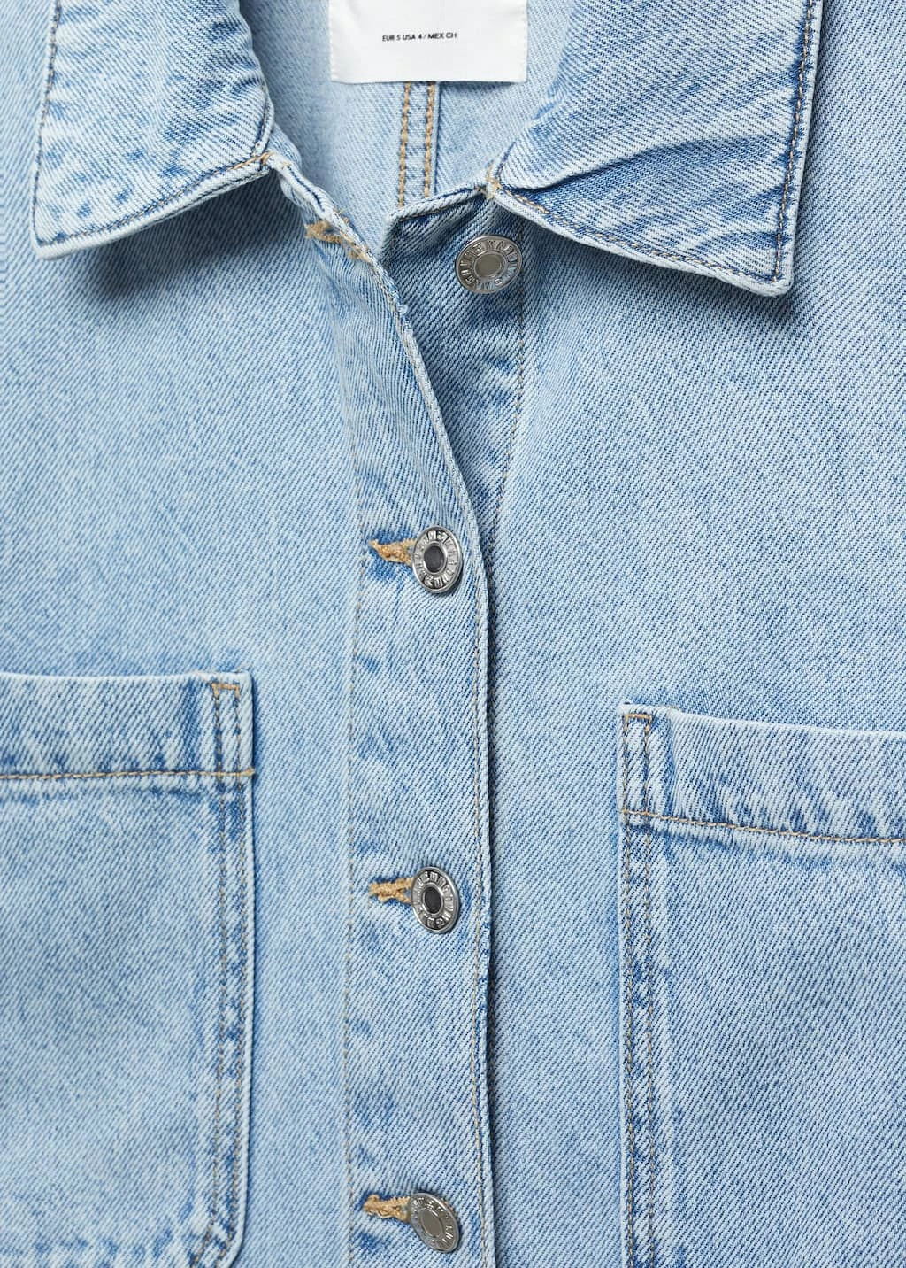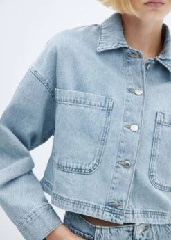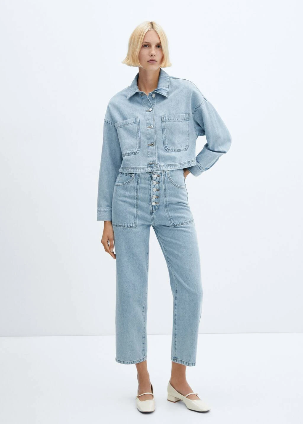 tissu en coton de style jean, coupe droite, coupe courte, col chemise, manches longues avec poignets boutonnes, fermeture boutonnee sur le devant, deux poches plaquees sur le devant, total look, le mannequin mesure 179 cm et porte une taille 36Composition: 100% coton